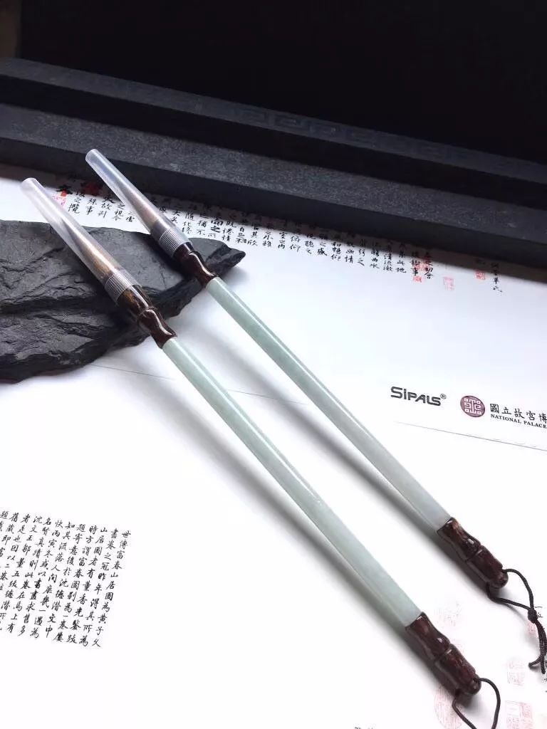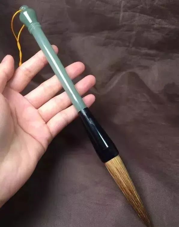 玉雕毛笔还有一种实用的,笔杆用玉做的,笔头用羊毫或者狼毫、兼毫制成。对又爱玉又喜欢书画的人来说,真是两全其美,一边书画,一边盘玩收藏。悬于桌案笔架之上,赏心悦目,其乐无穷。