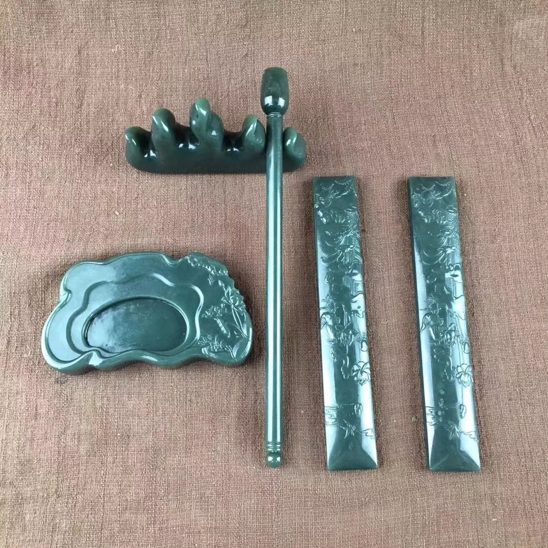 玉雕中也有成套的文房,毛笔、砚台、笔搁、镇纸、砚滴、笔洗等等小巧精致的美物。