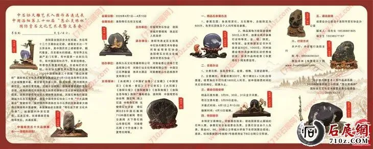 组委会办公室设于洛阳市赏石协会办公室联系人:祁先生 18538881805 →联系我时:请一定说明是在【710z中国石展网】看到的信息~谢谢!侯女士 15538577187 →联系我时:请一定说明是在【710z中国石展网】看到的信息~谢谢!