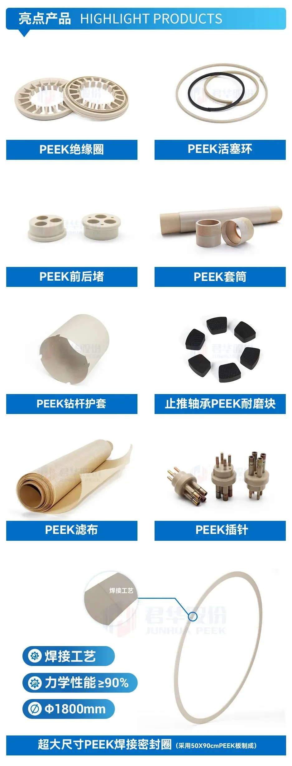 君华还将展示PEEK绝缘圈、、PEEK前后堵、PEEK止推耐磨滑块、PEEK开口密封环、PEEK接插件、压缩机PEEK阀片、星轮、超耐高温JUNHUA-HT4600CF30阀座、高温电机的连续CF/PEEK复合材料转子护套及多种规格的PEEK滤布滤网等。