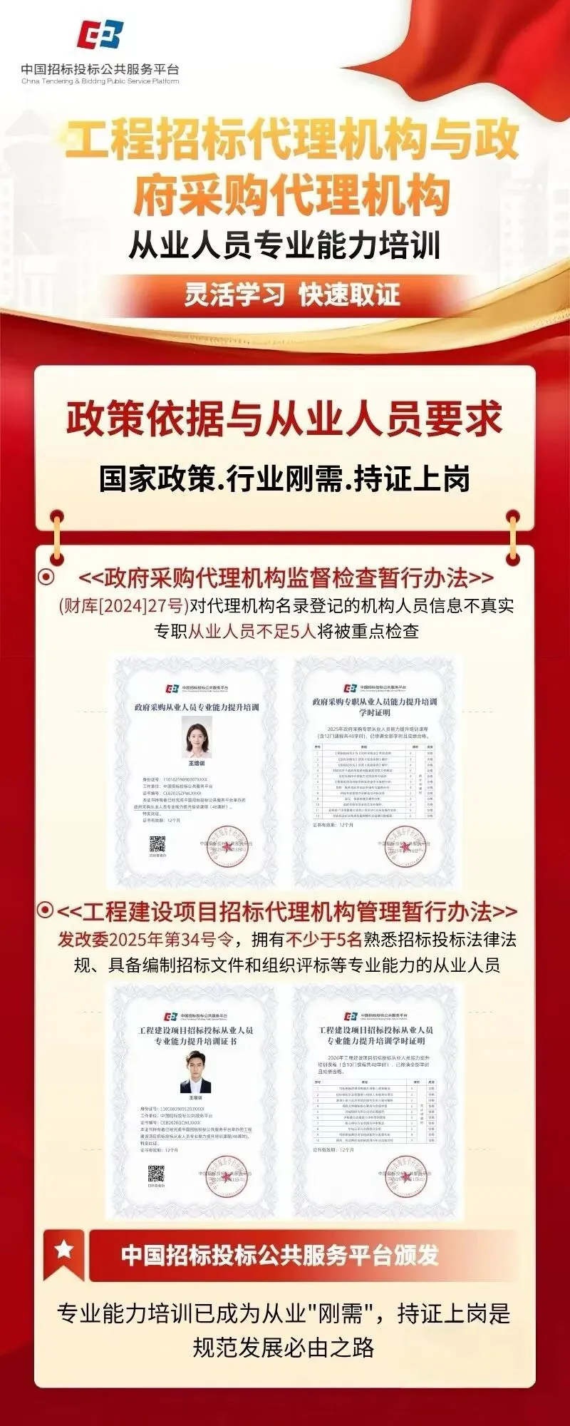 内容:招投标法规、文件编制、评标组织、流程规范、风险防控等 形式:线上学习,灵活方便 作用:系统提升专业能力,证书可作为能力证明,用于机构合规备查。