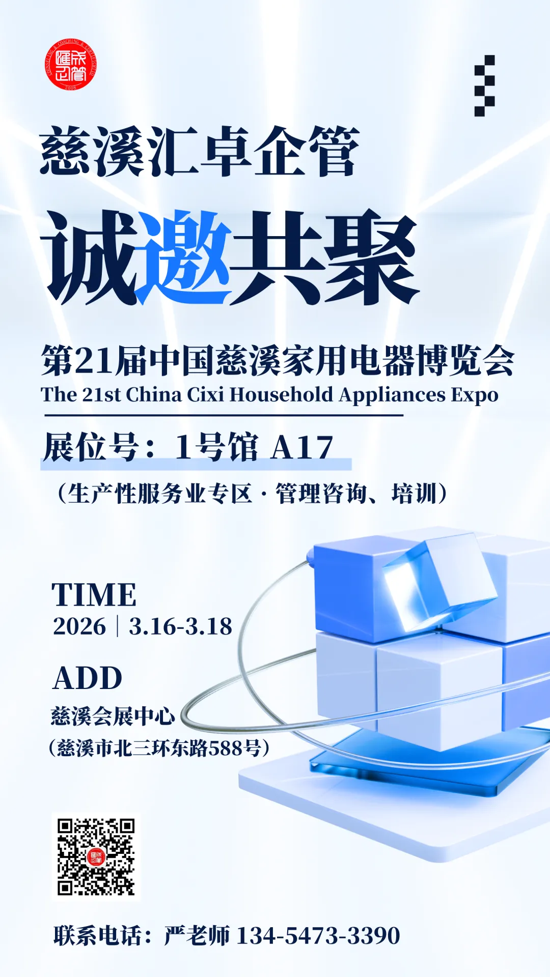慈溪市汇卓企业管理服务有限公司(以下称“慈溪汇卓”)作为汇成企管的子公司,将于3月16日至18日,在慈溪家电中心(1号馆展位号A17)亮相“第21届中国慈溪家用电器博览会”。我们诚挚邀请您来到我们展位,共探企服智慧,共话专业未来!
