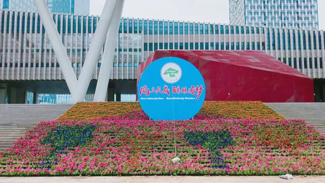 此次 “五一”文化中心广场花卉栽摆总数量约十万余盆、十余个花色,主要由多色矮牵牛、一串红、橙色万寿菊、黄色万寿菊等组成。时令花卉竞相盛开,缤纷的色彩相互交织,摇曳的花姿生机盎然。在文化中心广场北侧大台阶上加入主体景观雕塑,以烟台特色之一的美酒文化,“风土天成,酝酿逐梦”为主题,周边采用多色矮牵牛、万寿菊、一串红草花勾勒出红酒杯的造型,呈现出在美酒酝酿下的逐梦多彩烟台景观。