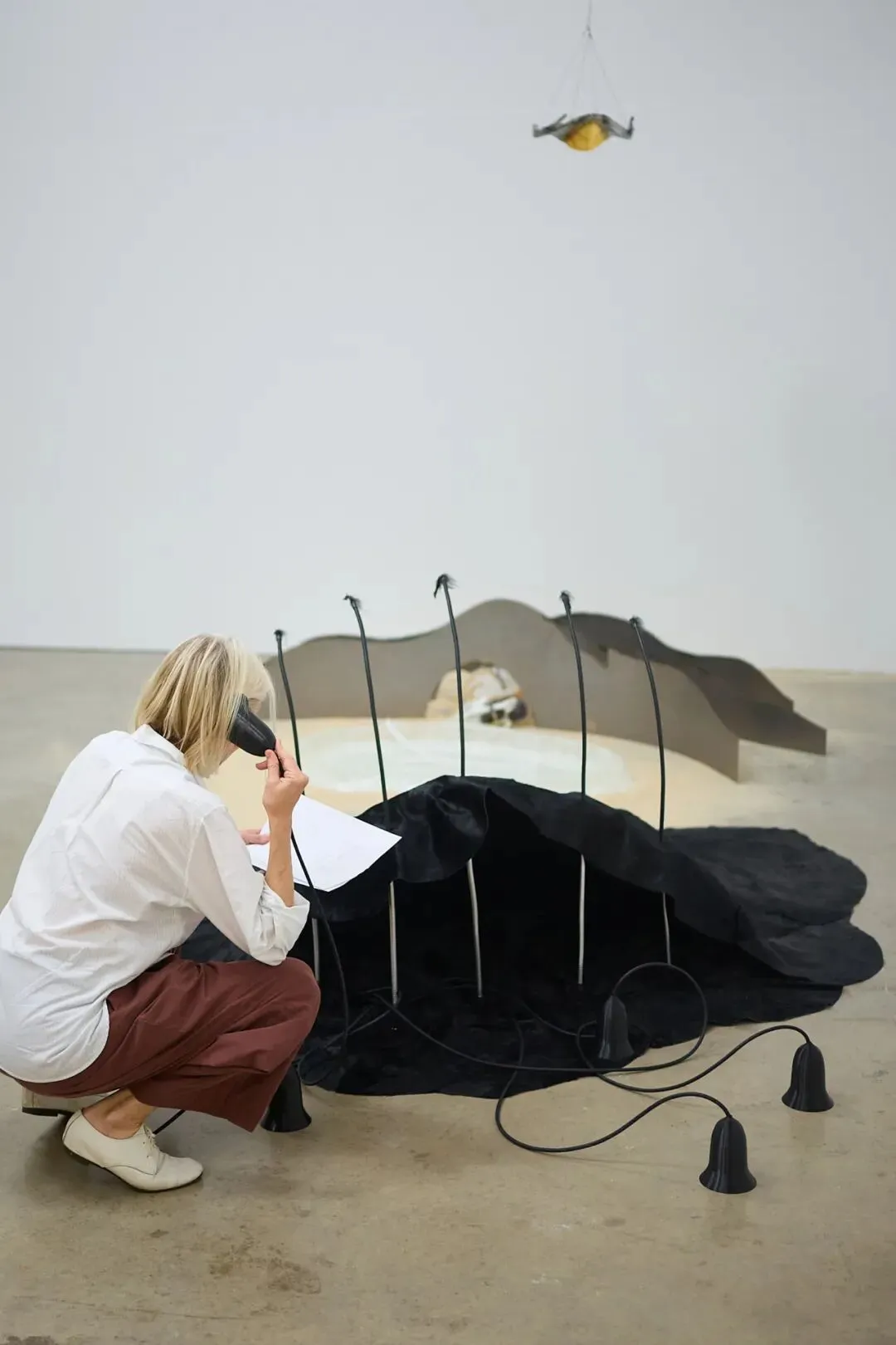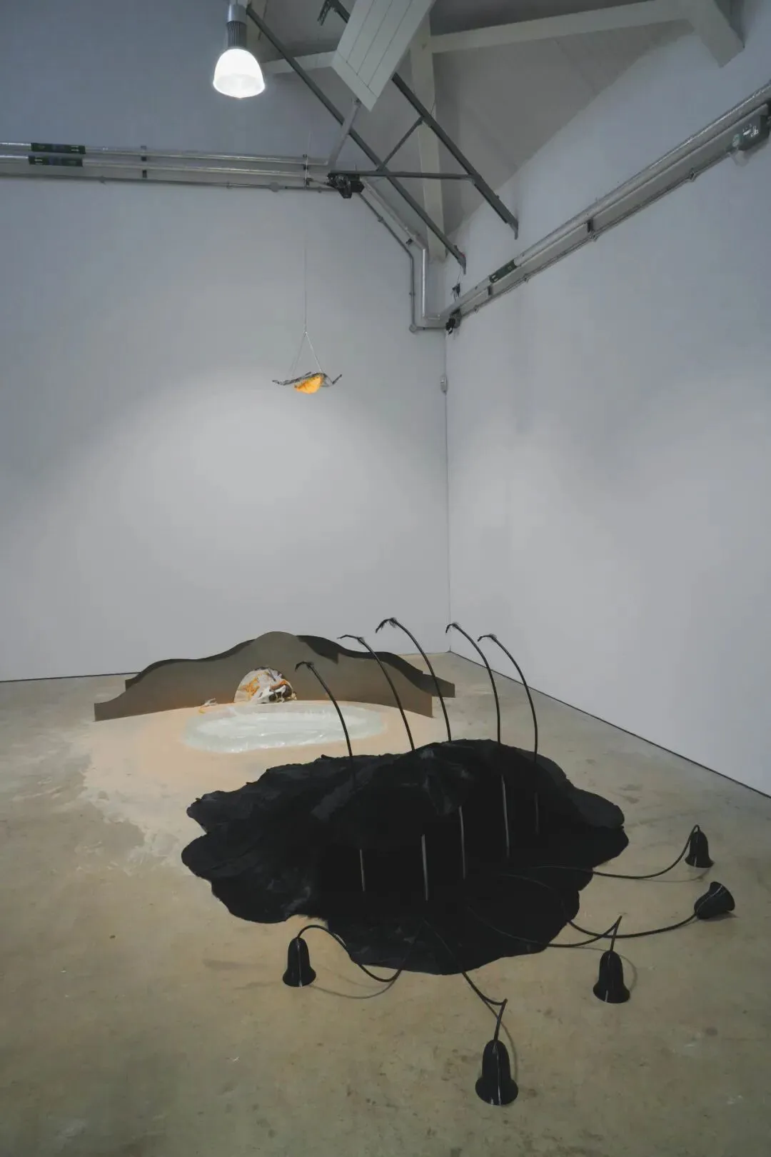 《Sunken Echoes》中,黑色织物构成的“山体”、半透明的壳体、悬吊的类生物器皿,以及地面的沉积痕迹,被布置成一种互相牵引又彼此掣肘的状态,共同构成一个势场(shi field)。机械结构的介入并非为了制造运动,而是将这种“势”的牵引关系推向可见:每一次摆动、每一道褶皱、每一处沉积,都是势能在物质中留下的痕迹。