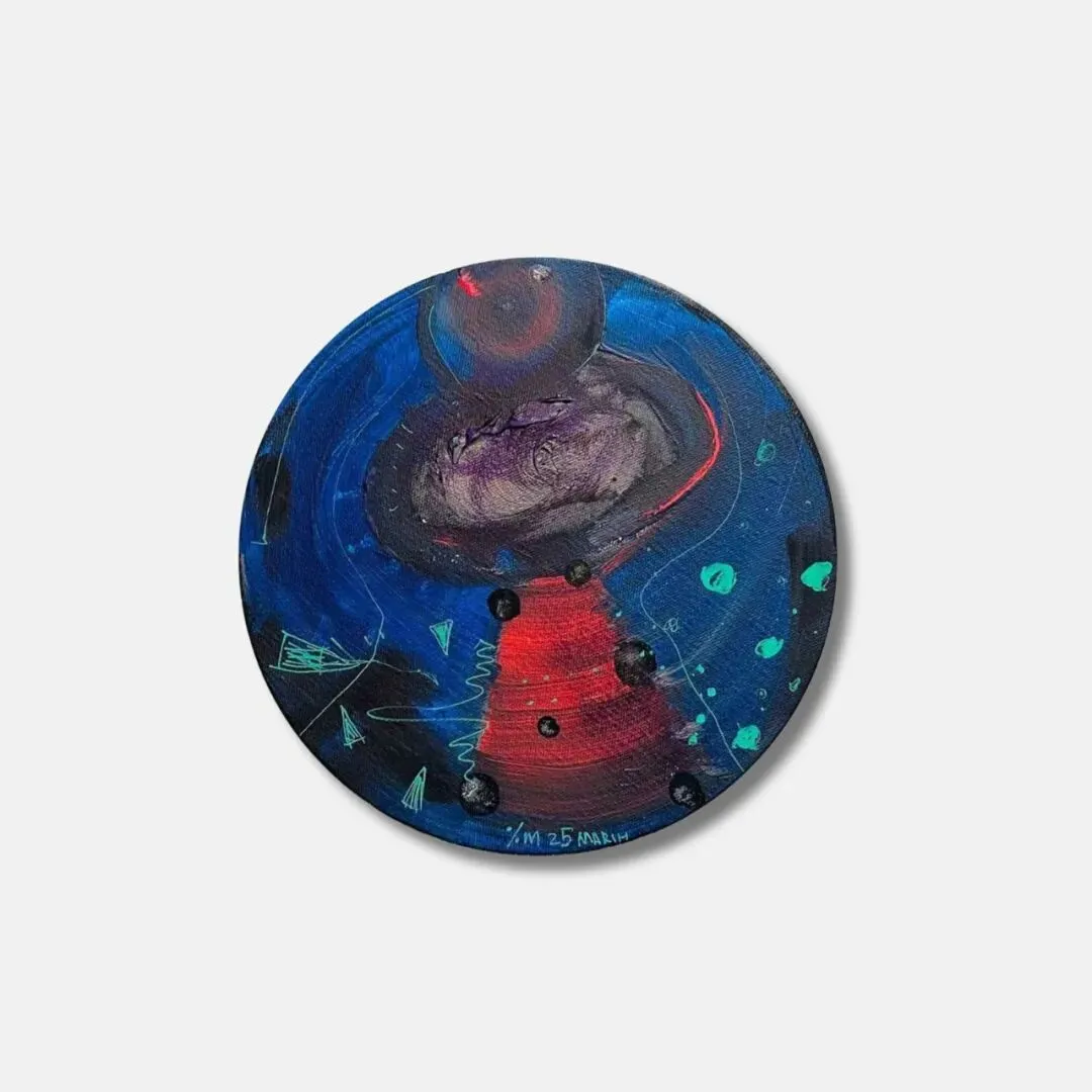 她的作品常以高张力的视觉结构展开,通过色彩的碰撞、线条的游走与形态的交织,将情绪经验与哲思转化为充满能量的视觉场域。她在画面中建立明确的边界关系,同时又通过笔触的晕染与色块的渗透不断打破这些界限,形成一种“冲突中的和谐”。圆形、三角形与不规则曲线等几何元素在其作品中被赋予有机的生命感,隐喻个体在复杂系统中的存在状态。