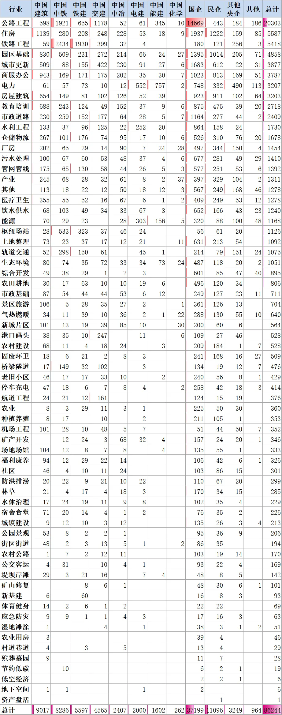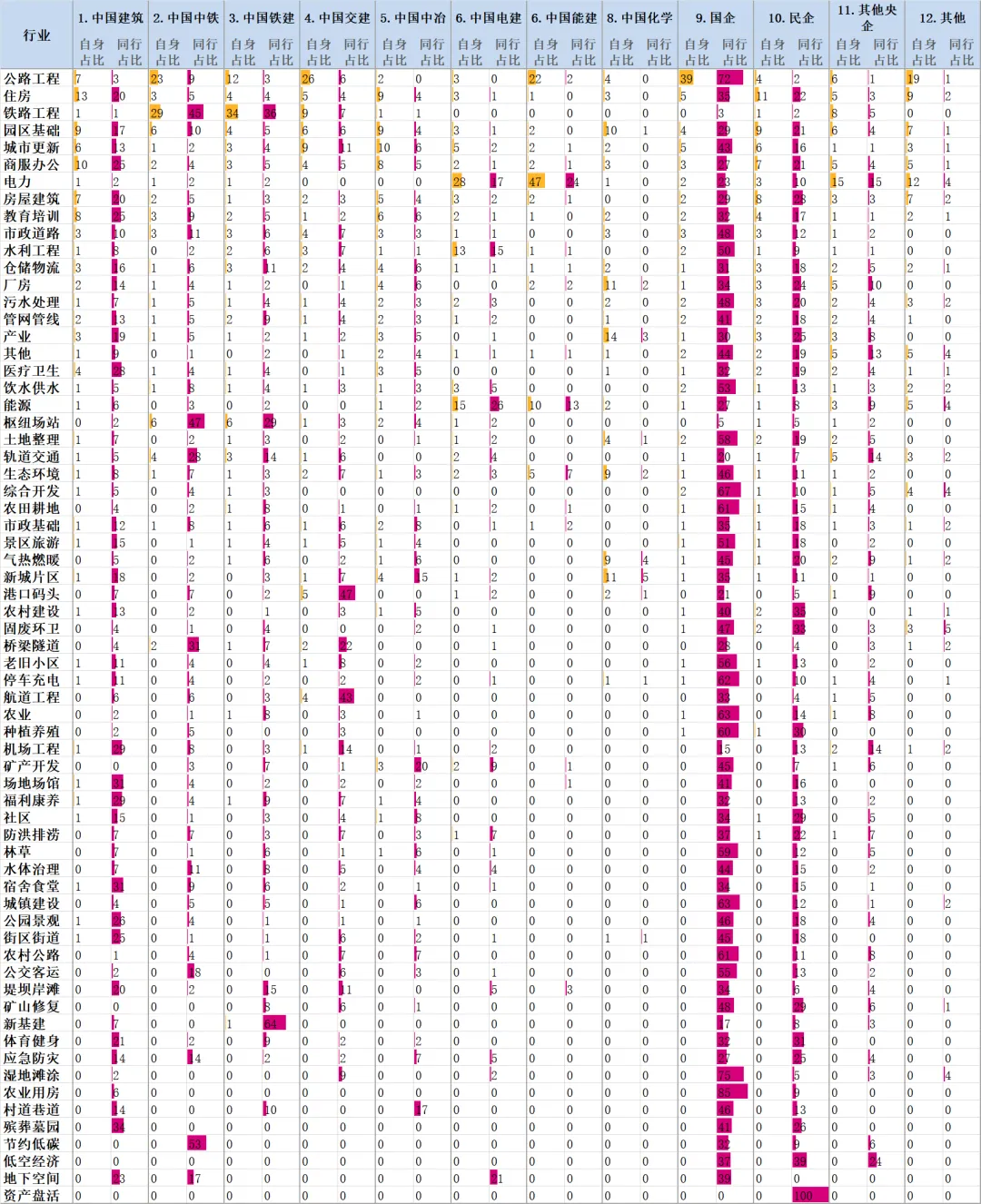 在表1的首列我们列出了细分的66个行业(这是我们的行业分类体系的行业中类),接着我们列出了八大建筑央企、国企、民企、其他央企等企业的两类比例指标,一类是“自身占比”,即纵向来看每一类企业自身中标的项目金额占自身中标总金额的比例,另一类是“同行占比”,即横向来看每一类企业在特定行业的中标金额占该行业总中标金额的占比。