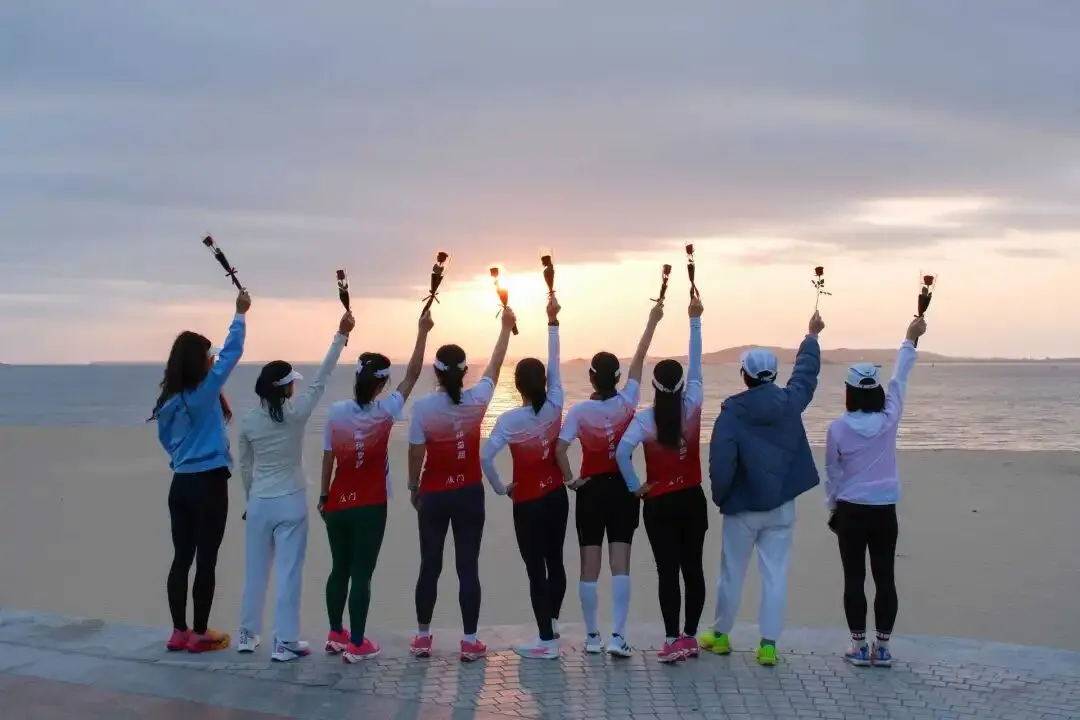各位女跑者手持玫瑰,在朝阳下留下最美倩影,“她力量”自在生长、自有光芒。