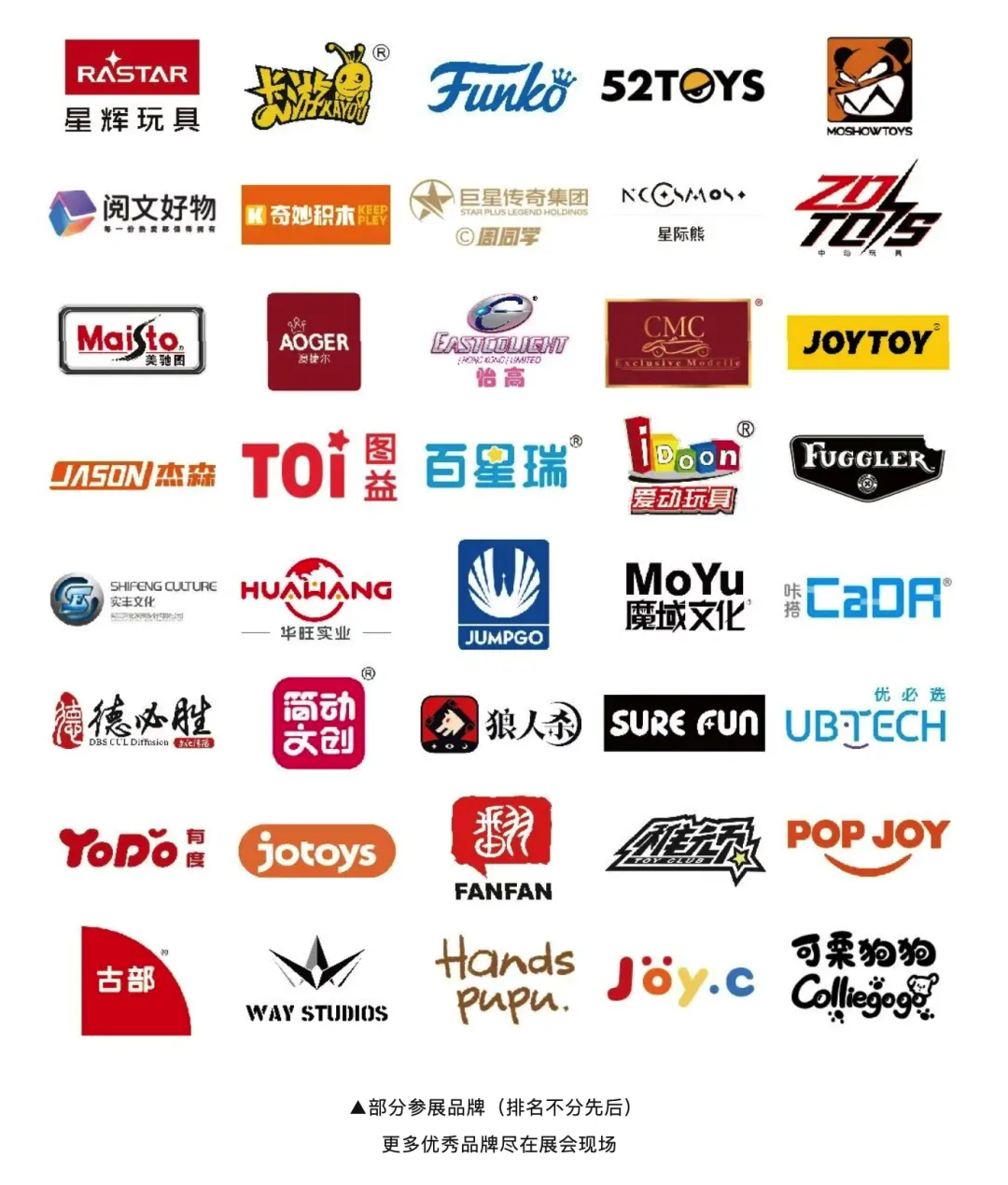 本届展会参展品牌和企业包括星辉、卡游、Funko、52TOYS、模寿MOSHOWTOYS、阅文好物、启梦、周同学、星际熊、中动玩具、太达、澳捷尔、怡高、西姆斯、JOYTOY、杰森、图益、百星瑞、爱动、探玩、实丰、华旺、展高、魔域文化、双鹰、德必胜、简动文创、狼人杀、果然有趣、优必选、有度、JOTOYS、翻翻动漫、趣顽、POPJOY、古部、环世、Handspupu、Joy.C集物社、可栗狗狗等,将携数以千计新品联袂参展!