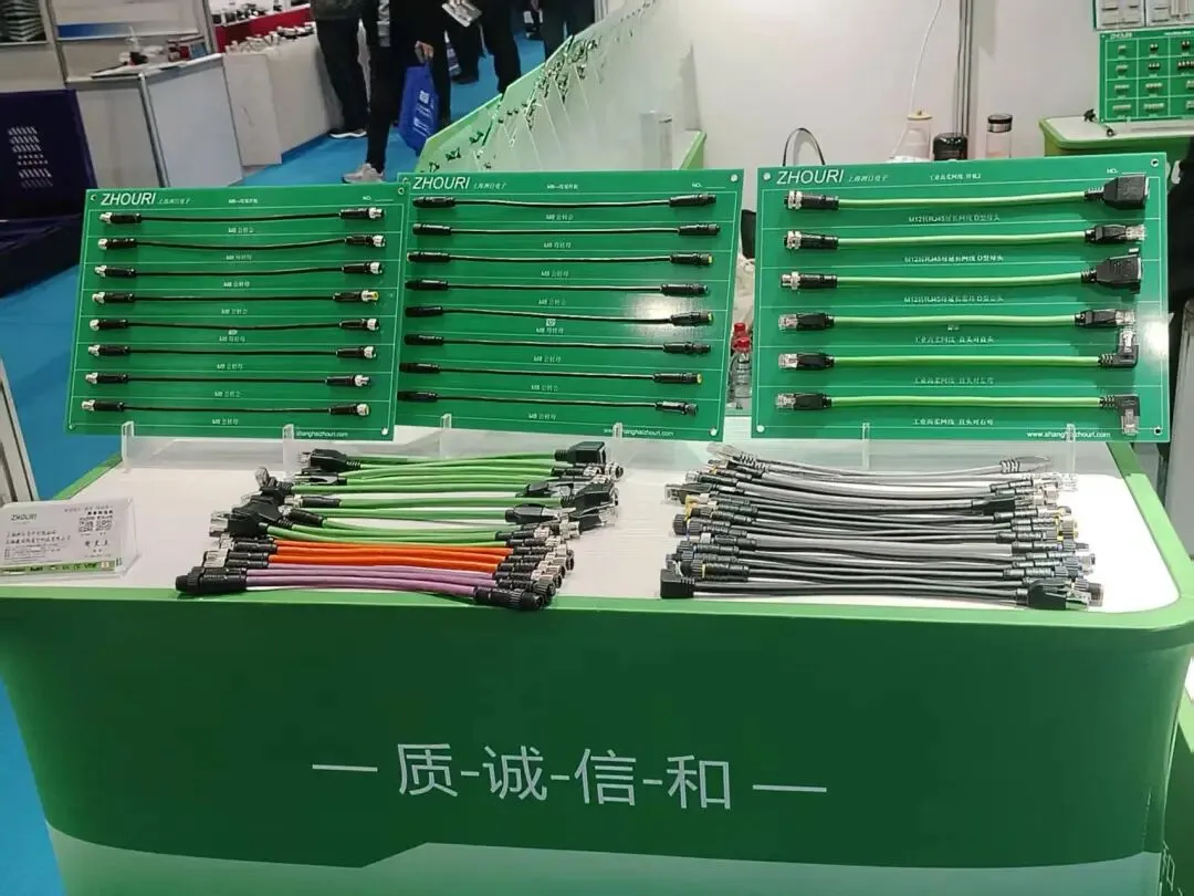 本次洲日电子携带最新模组端子台、工业高速网线、M8/12工业相机转接线、各类伺服驱动控制线在现场展示。
