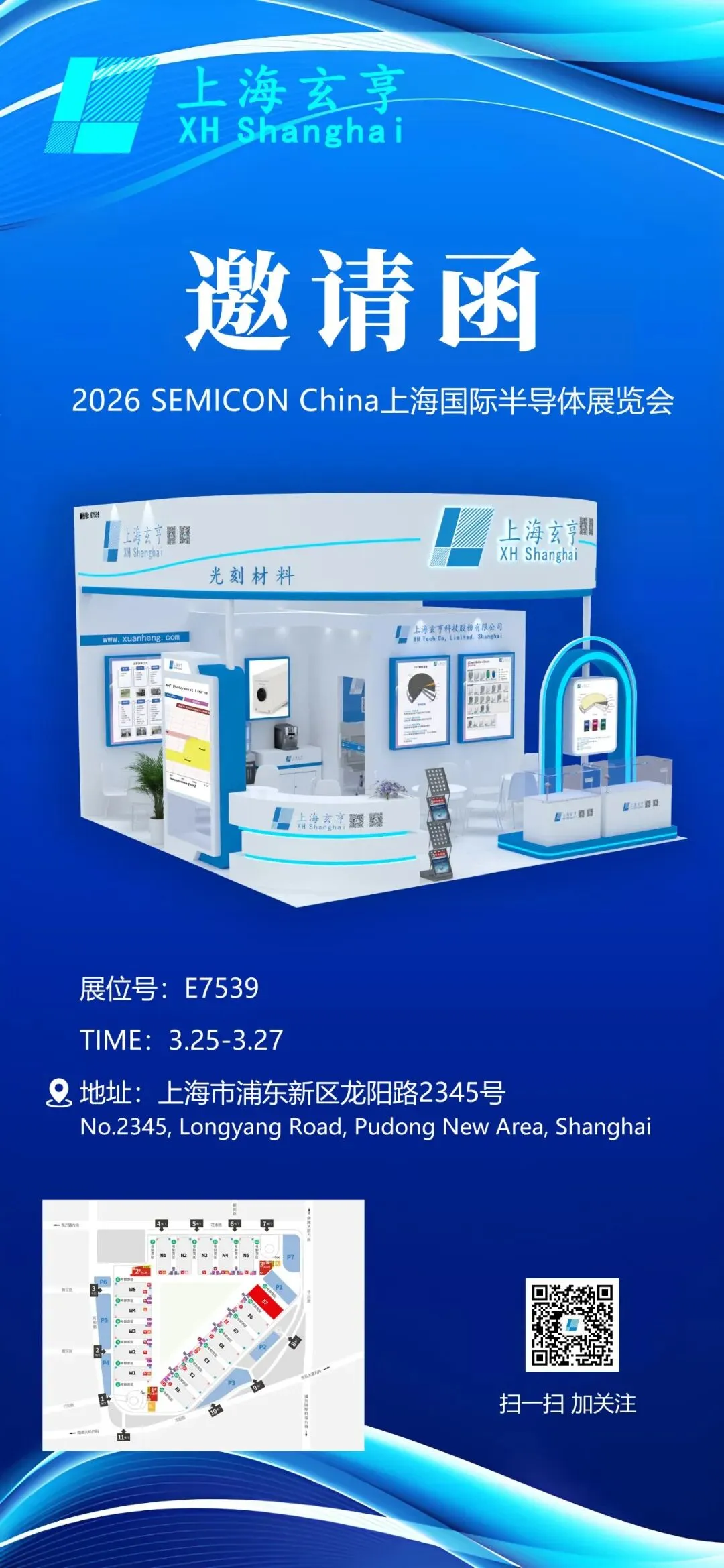 科技浪潮奔涌,芯机遇正当时!上海玄亨实业有限公司诚挚邀请您莅临2026 SEMICON China 上海国际半导体展览会,与我们一同聚焦光刻材料前沿技术,共话半导体产业发展新篇。