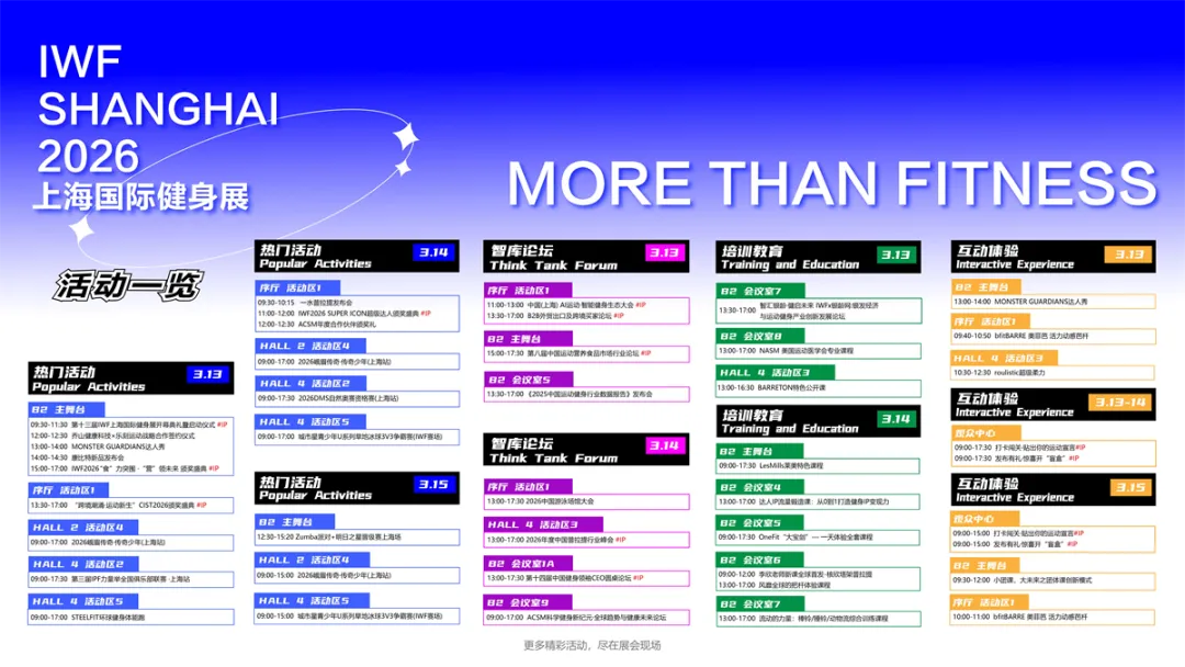 为期三天的展会将呈现涵盖智库论坛峰会、行业颁奖典礼、课程表演互动、新品发布会、团操体验课等多种类型的活动,实现行业交流与大众体验深度融合,旨在打造一场全民参与的“健身大派对”。