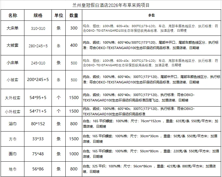 甘肃会展中心(集团)有限责任公司兰州皇冠假日酒店(以下简称酒店),根据实际经营需要,酒店2026年布草采购项目进行竞争性谈判,现诚邀资质合格的单位参加。