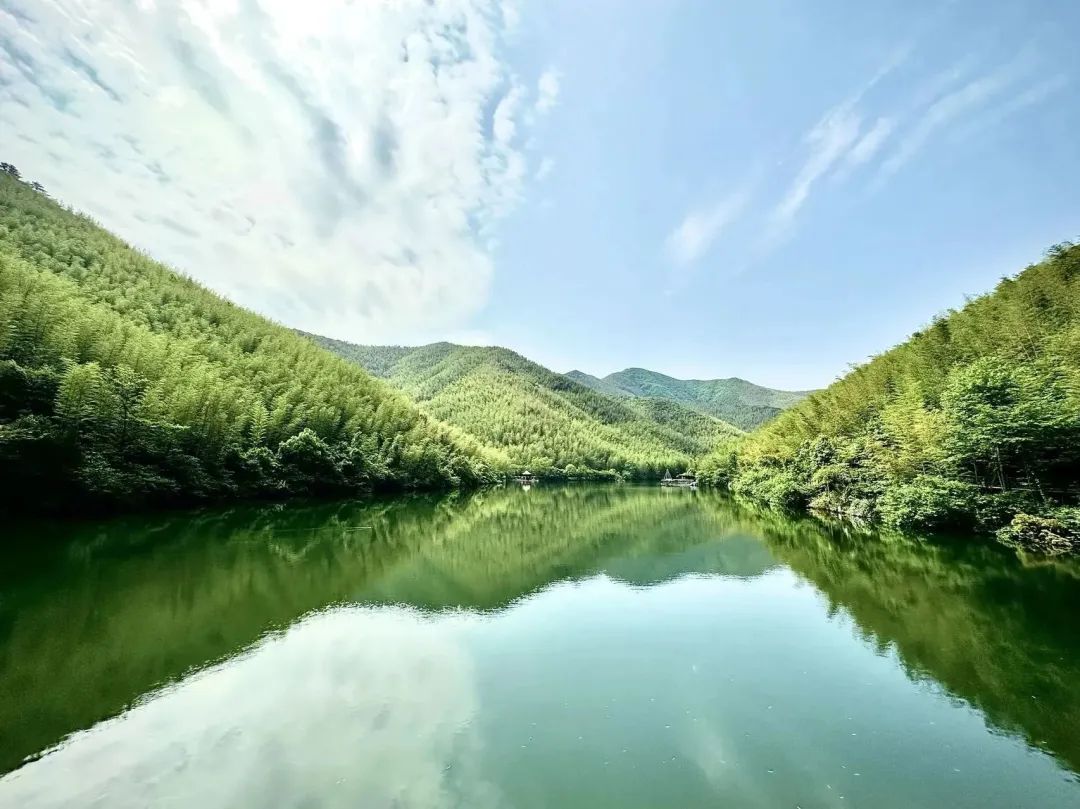 在两山夹峙中,静湖与山色交映成趣,竹在水中长,水在竹间流,山水之间,如诗如画。