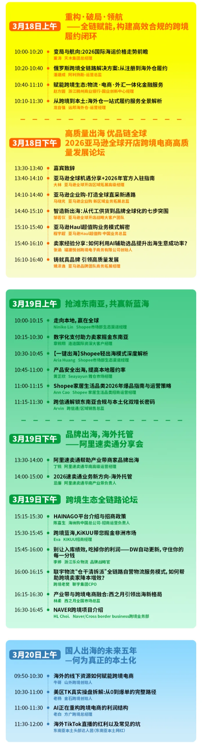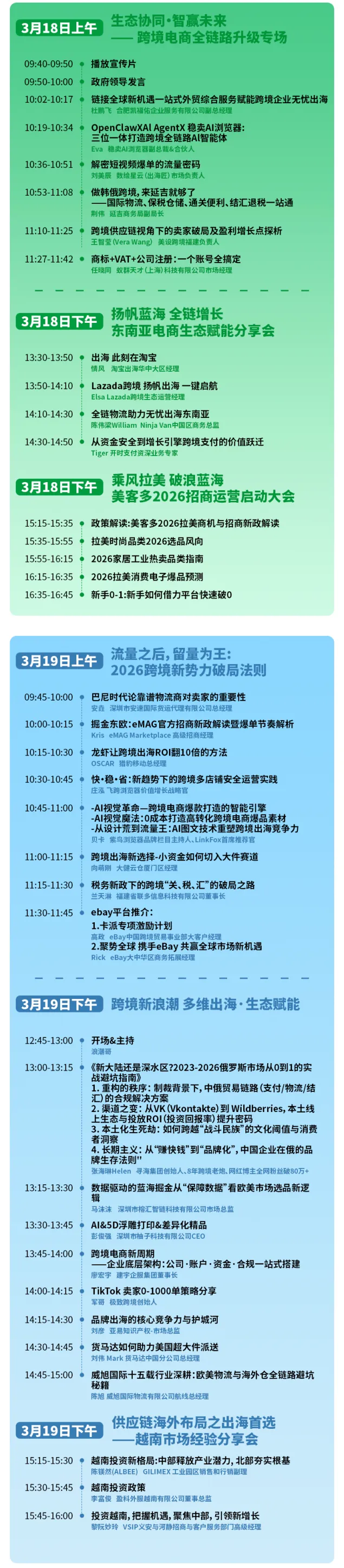 本届展会吸引亚马逊全球开店、eBay、沃尔玛全球电商、TikTok Shop、SHEIN、TEMU、阿里巴巴国际站、全球速卖通、快手海外SnackVideo、中国制造网、淘宝出海、敦煌网、Shopee、日本乐天、Coupang、美客多、Wayfair、eMAG、OTTO、Cdiscount、 Wildberries, Shoplazza, 168Mall,Pigu、 Bol.com、 Daraz、 Jumia、 JoomPro,KiKUU, Voghion, Ozon, Google Ads, Shopify等60多个跨境电商平台参加将带来各平台最新政策解读,以及面向卖家的扶持计划。