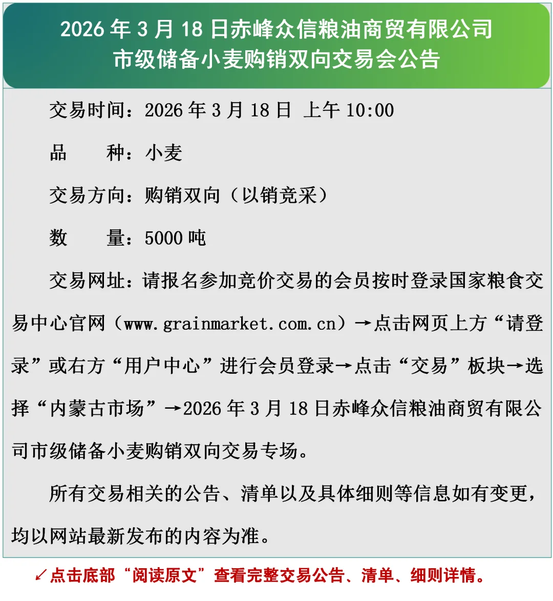 2026年3月18日赤峰众信粮油商贸有限公司市级储备小麦购销双向交易会公告