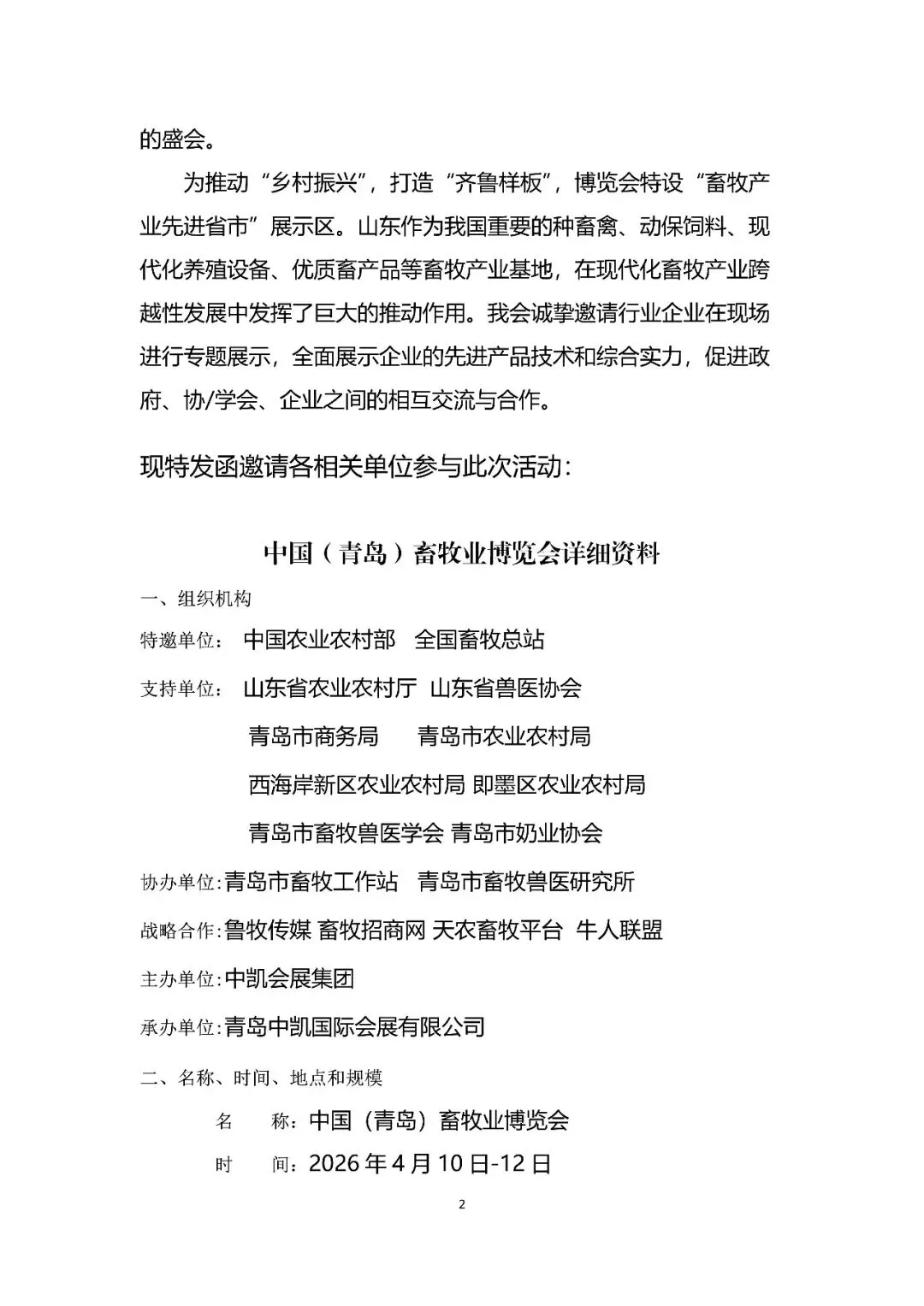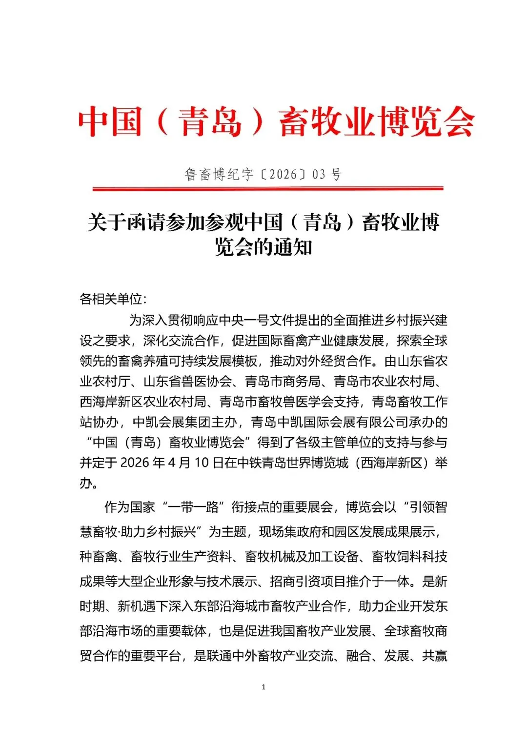 为深入贯彻响应中央一号文件提出的全面推进乡村振兴建设之要求,深化交流合作,促进国际畜禽产业健康发展,探索全球领先的畜禽养殖可持续发展模板,推动对外经贸合作。由山东省农业农村厅、山东省兽医协会、青岛市商务局、青岛市农业农村局、西海岸新区农业农村局、青岛市畜牧兽医学会支持,青岛畜牧工作站协办,中凯会展集团主办,青岛中凯国际会展有限公司承办的“中国(青岛)畜牧业博览会”得到了各级主管单位的支持与参与并定于2026年4月10日在中铁青岛世界博览城(西海岸新区)举办。