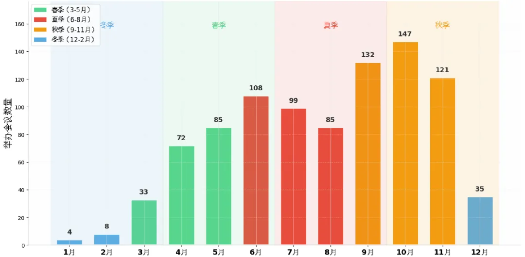 学术会议时间分布呈现鲜明淡旺季差异,直接影响场地方、会务服务机构的资源调配与成本控制,从业者需重点关注: