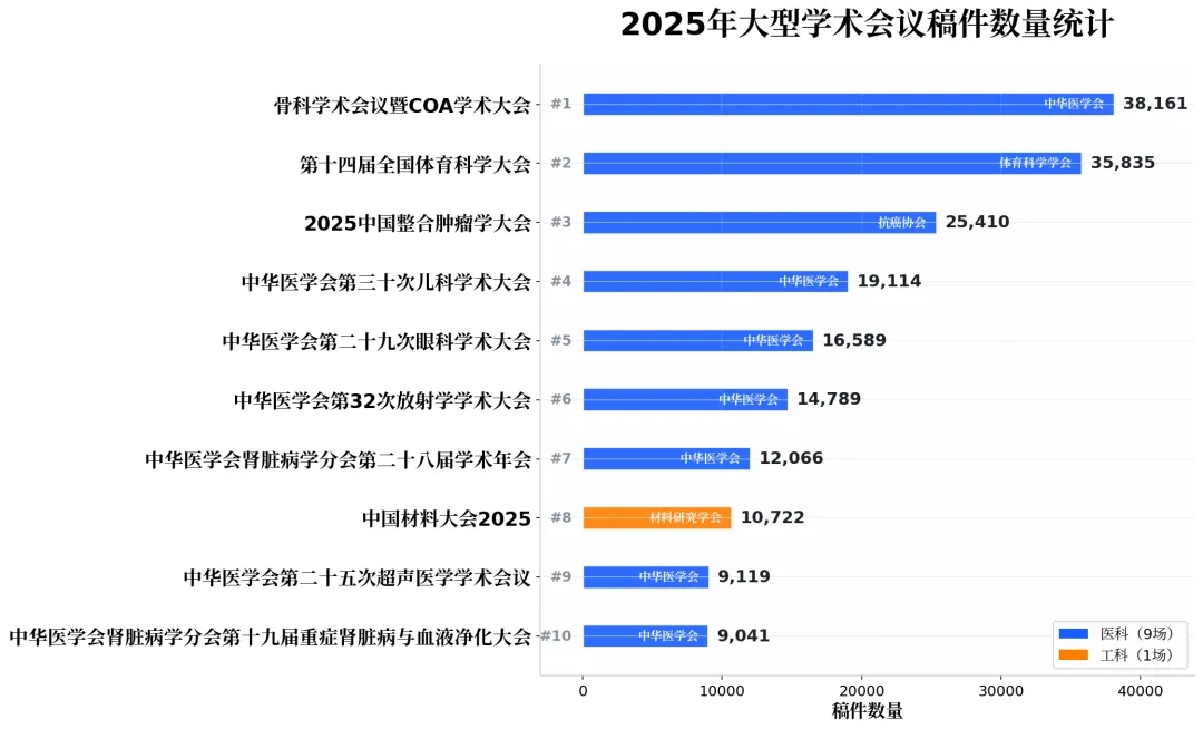 医科不仅在会议数量上占据近三分之二的市场份额,更在超大型会议规模、投稿学术产出、品牌影响力方面全面领先;与之相对的是,交叉学科供给严重不足,跨学科学术交流机制仍不完善。