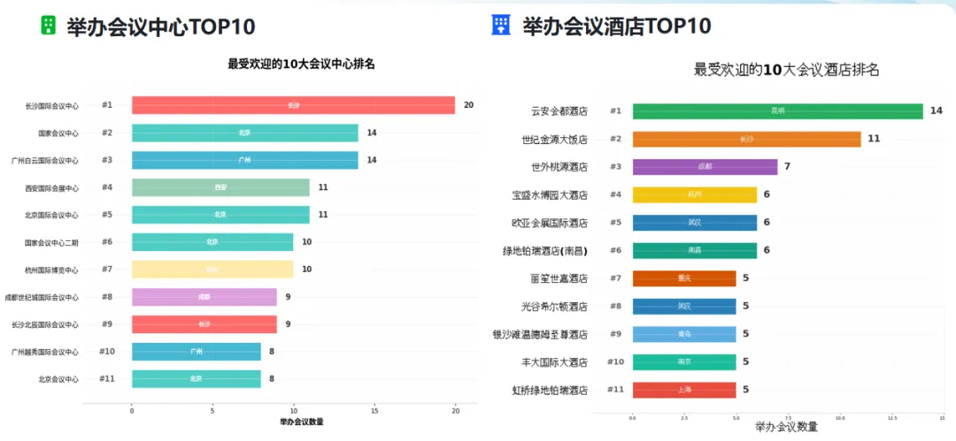 场地排名:会议中心TOP10中,长沙国际会议中心登顶;会议酒店TOP3均为中西部城市(昆明、长沙、成都),充分彰显了中西部会议市场的强劲活力。