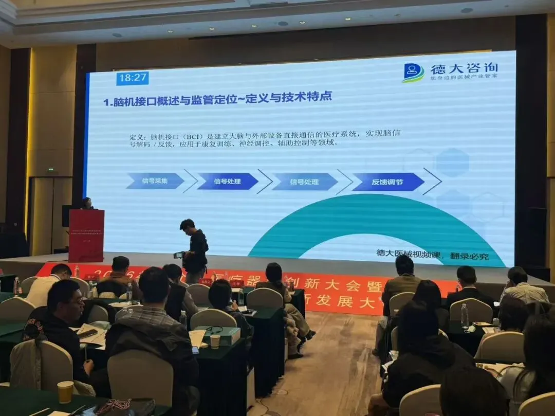 在2026植入介入医疗器械创新大会暨第四届心脑血管医疗器械创新发展大会上,德大咨询顾维曼老师就脑机接口(BCI)医疗器械的注册申报与合规策略发表了专题演讲,深入剖析了“植入”与“介入”时代下,BCI技术从研发走向临床的关键路径。