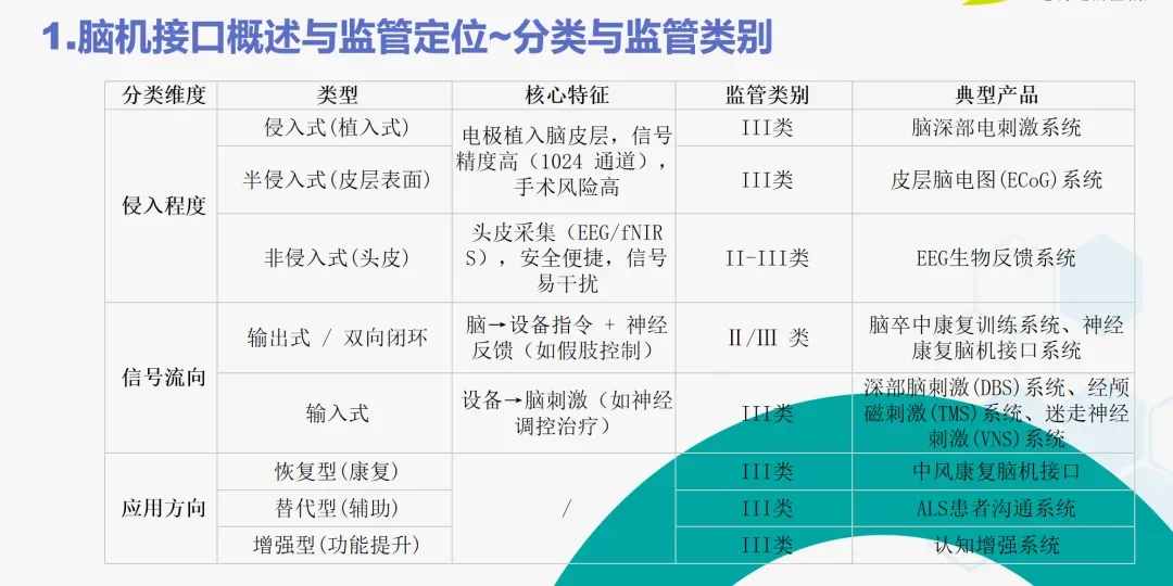 侵入程度决定风险等级:从非侵入式(如EEG头戴设备,通常为II/III类)到半侵入/植入式(如皮层ECoG或深度植入电极,均为III类),监管要求和审评重点截然不同。