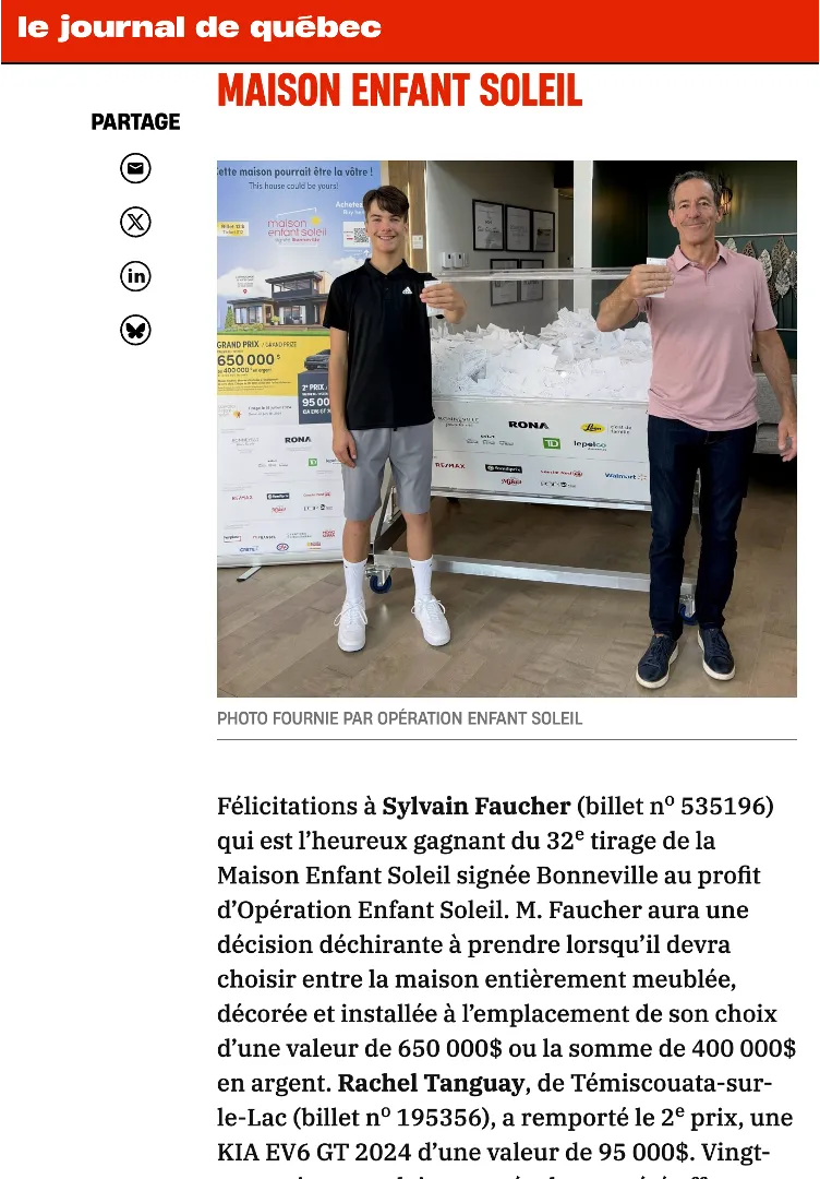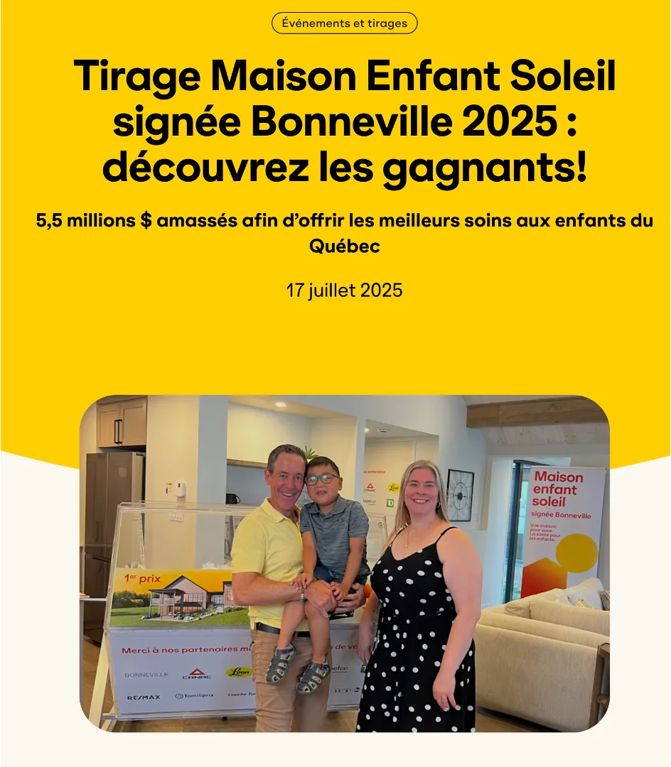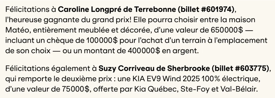 去年,魁北克 Enfant Soleil Maison 的大奖,就被一位来自 Terrebonne 的女士 Caroline Longpré 抽中。