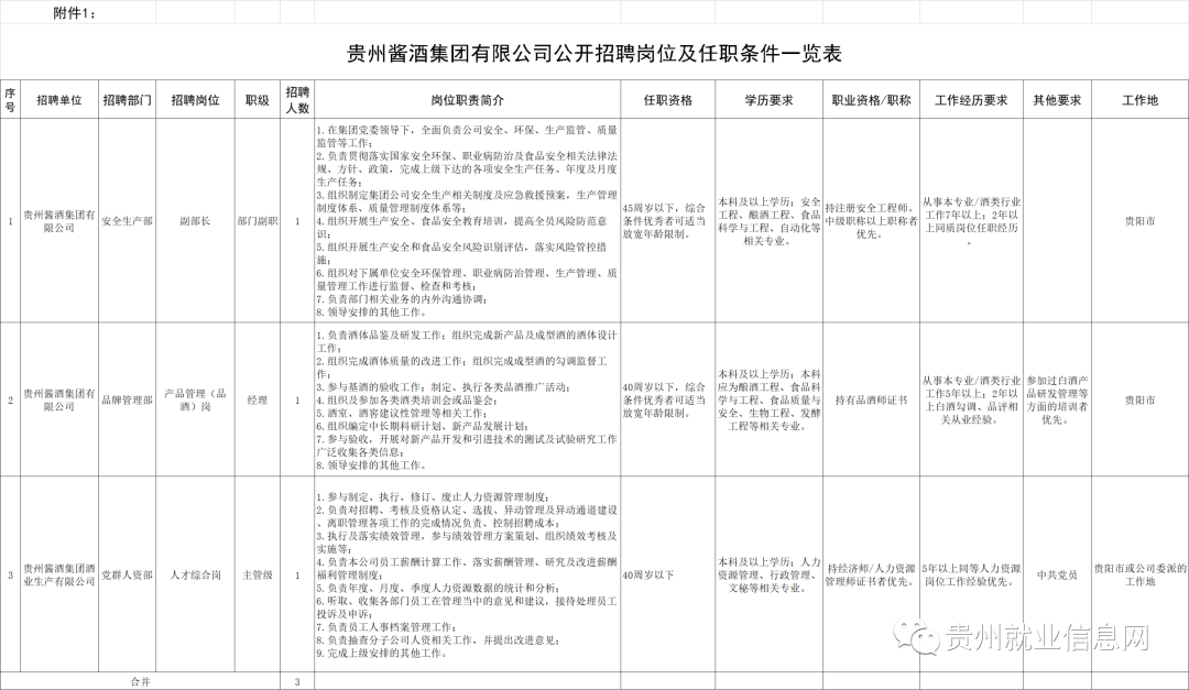 贵州酱酒集团及子公司本次面向社会公开招聘3人,具体招聘单位、岗位及要求详见附件《贵州酱酒集团有限公司公开招聘岗位及任职条件一览表 》(见附件1)。任职条件计算年龄、工作年限、任职年限或取得专业技术职称时间计算日截止到本人报名时间。