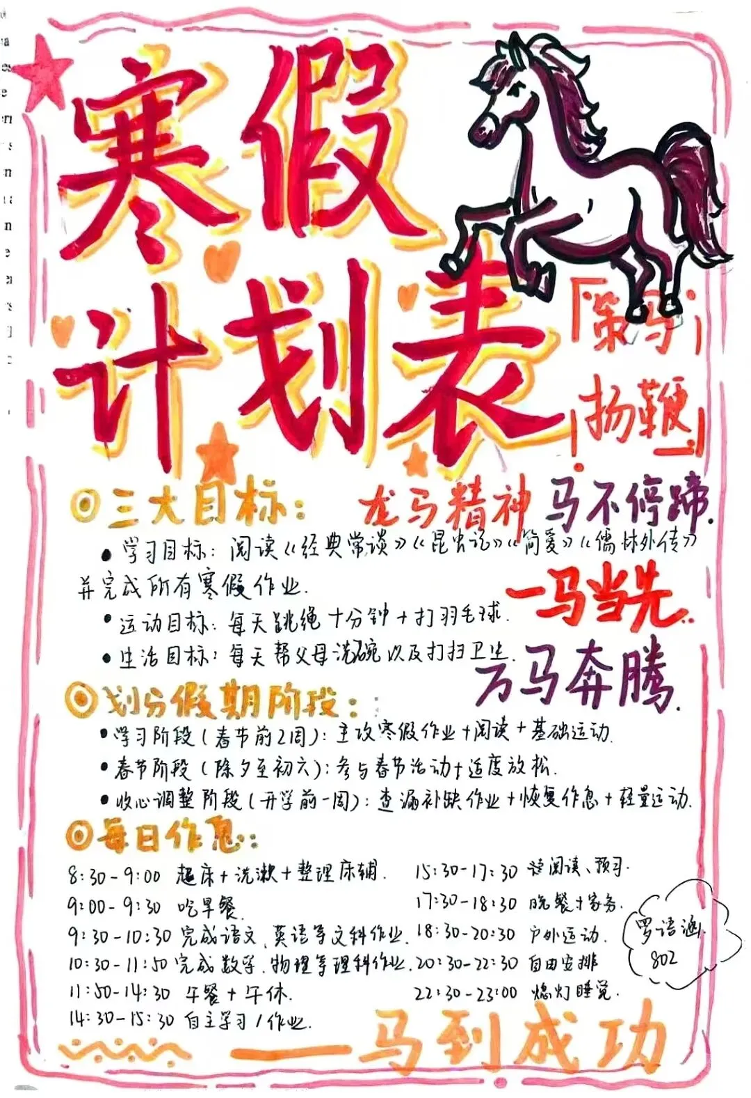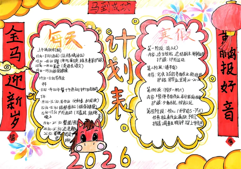 寒假计划表:作息时间、学习任务、运动项目、劳动任务……画得漂漂亮亮,执行得认认真真。