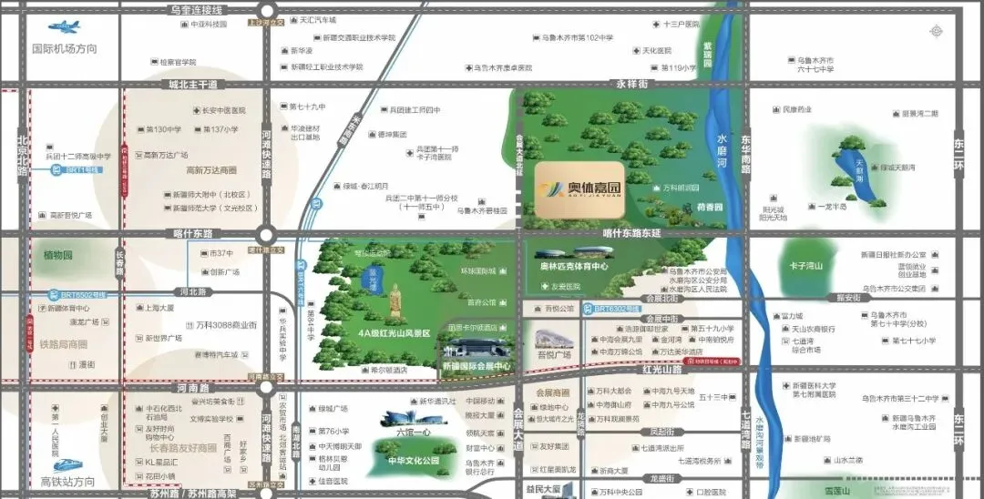 奥体嘉园位于会展片区的黄金十字路口,是串联乌鲁木齐城市资源、产业动能、未来红利的价值中枢。横向串联会展的成熟生活区与产业区,纵向连接主城核心区。随着会展片区南部的饱和,片区正稳步向北延伸,未来的发展不容小觑。