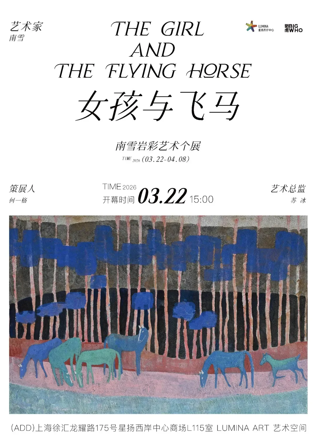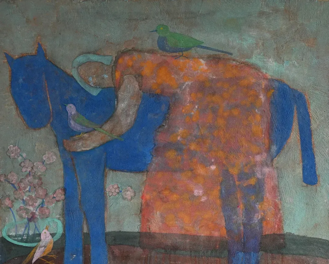 本次展览呈现了艺术家南雪近年来创作的40幅架上岩彩作品。在她的笔下,豹与花朵共存,蓝马与飞鸟相依,自然的呼吸在画布的肌理间流转,万物各得其所。其中,“马”作为艺术家南雪偏爱的意象,在不同的作品中呈现出不同的的精神性隐喻。作品《蓝色的马》沉静温暖,一匹温驯的蓝马与身着暖橙色衣袍的人物相依,肩头的飞鸟、案头的瓶花,共同构筑了一个静谧而充满生机的共生场景;而《蓝色马群》则将视线拉向更辽阔的自然,蓝、绿、青等不同色调的马群,在赤土与浅蓝的地面上悠然踱步,背景中垂直的赭色线条与层叠的蓝块,如同森林与天空的抽象转译,整个画面浑然天成。岩彩媒介的独特性也在此彰显,矿物颜料的颗粒感既强化了画面的厚重质感,又呈现出壁画般的斑驳肌理,让艺术家南雪的作品仿佛是从千年石窟中走出的当代寓言,让每一幅作品都成为可触摸的梦境叙事。