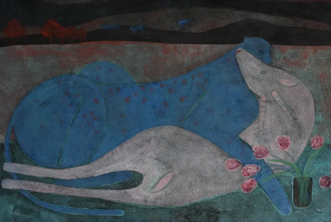 《蓝豹与羚羊》122cmX82cm 纸本矿物岩彩壁画