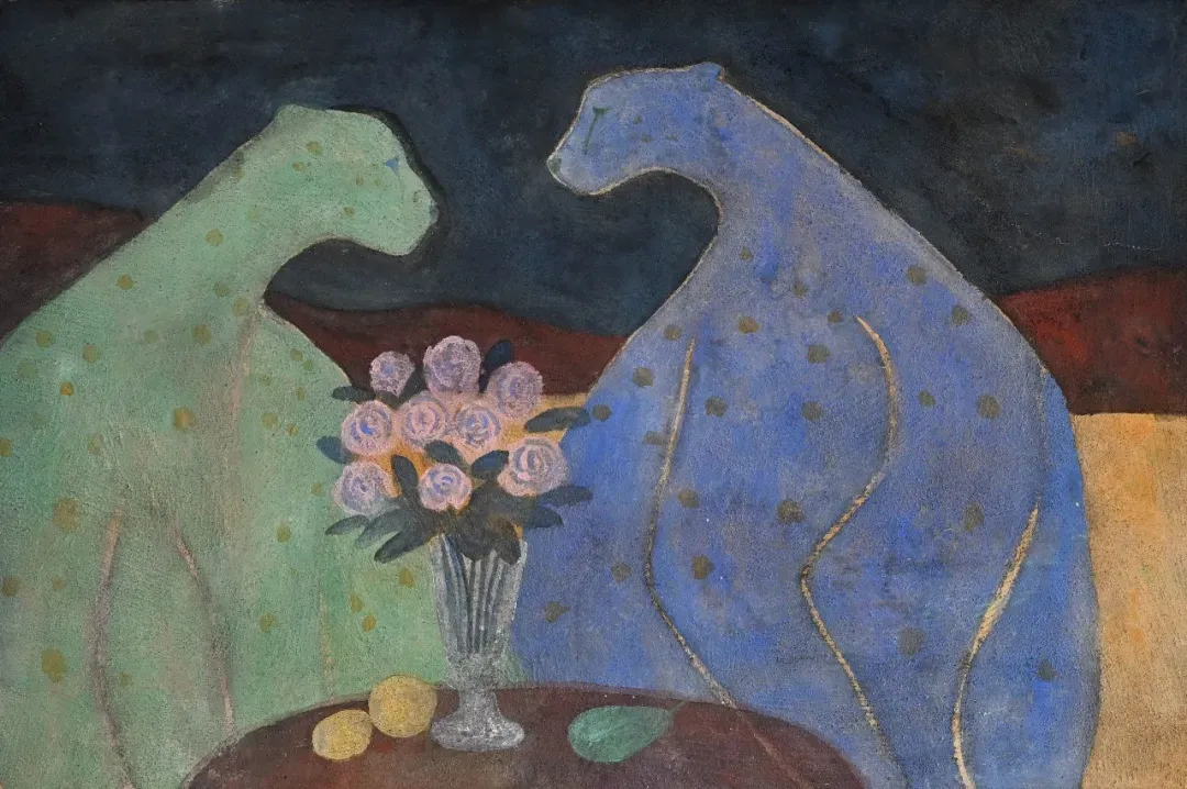 《玫瑰与双豹》95cmX65cm 纸本矿物岩彩壁画