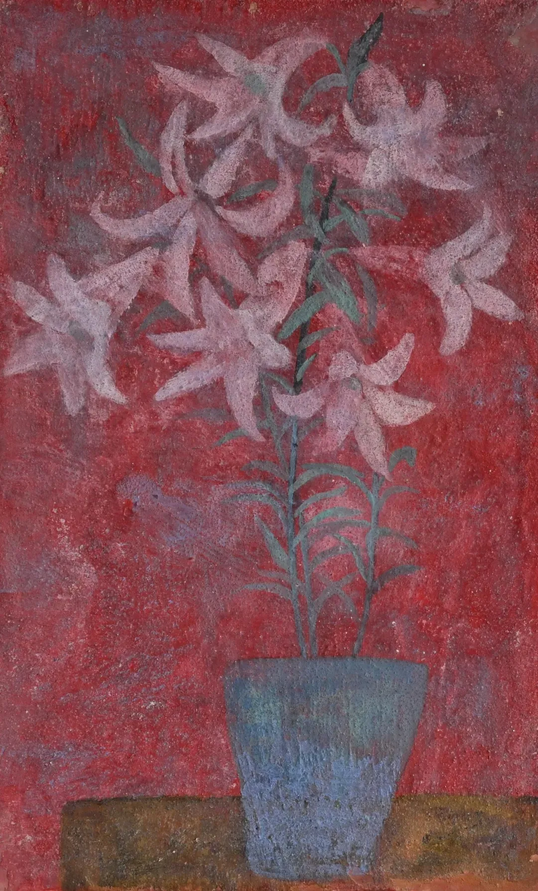 《红底百合》40cmX60cm 纸本矿物岩彩壁画