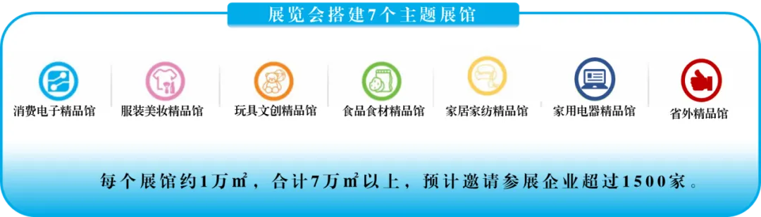 7大主题特色展区:展会搭建7个主题展馆:家用电器精品馆、消费电子精品馆、服装美妆精品馆、玩具文创精品馆、食品食材精品馆、家居家纺精品馆、省外精品馆。每个展馆约1万㎡,合计7万㎡以上,预计邀请参展企业超过1500家。