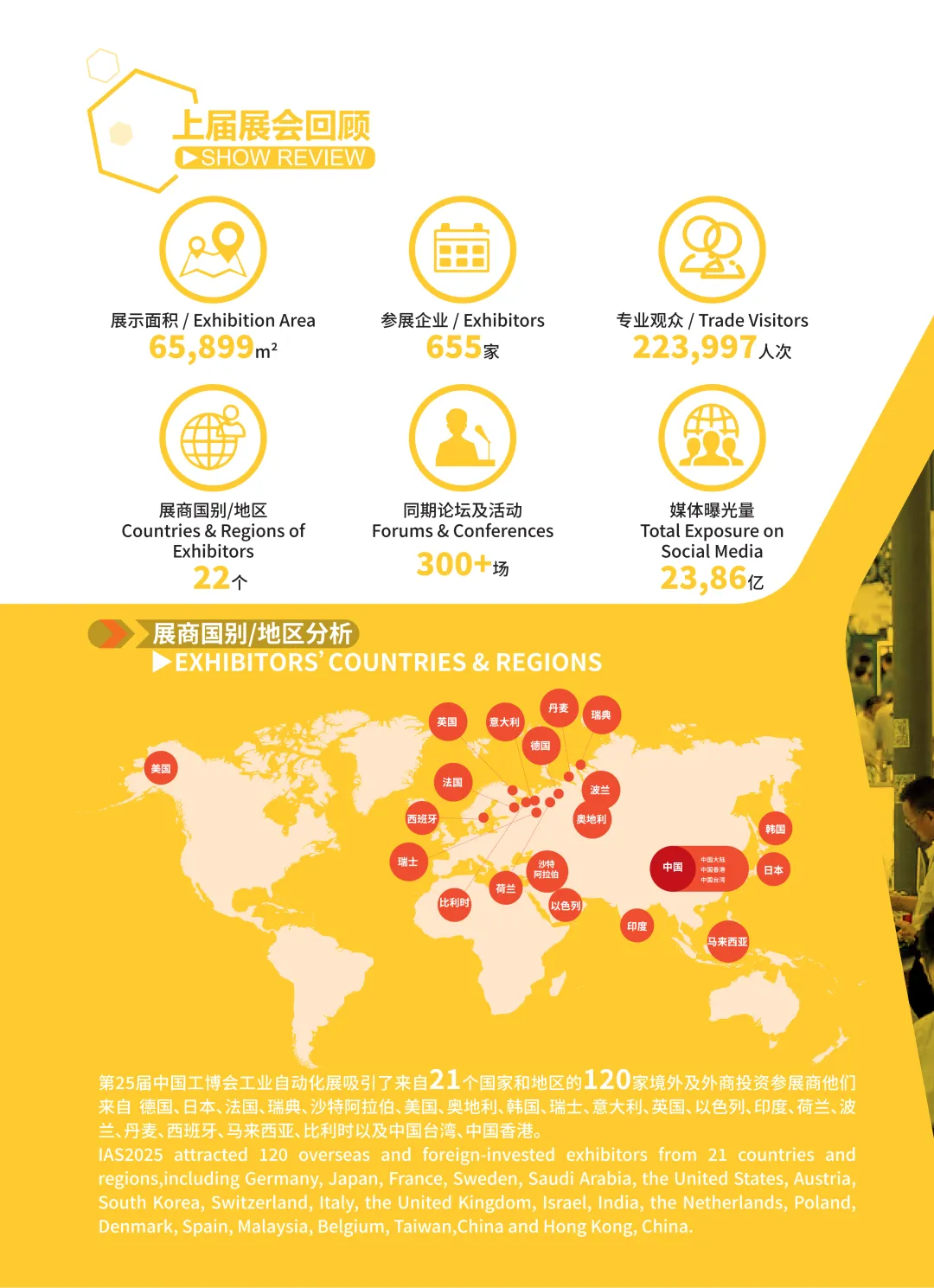 顶流平台,链接全球智造资源作为中国工博会旗舰专业展,IAS 已成为全球制造业技术创新的「风向标」和产业对接的「黄金枢纽」。上届展会吸引 21 国及地区境外展商、133 国及地区 22.3 万 + 专业观众到场,91.86% 观众参与采购决策,汽车制造、新能源、电子设备等核心领域买家云集,华东核心市场全覆盖,全球精准客群一站式链接,参展即抢占国内外双重商机!
