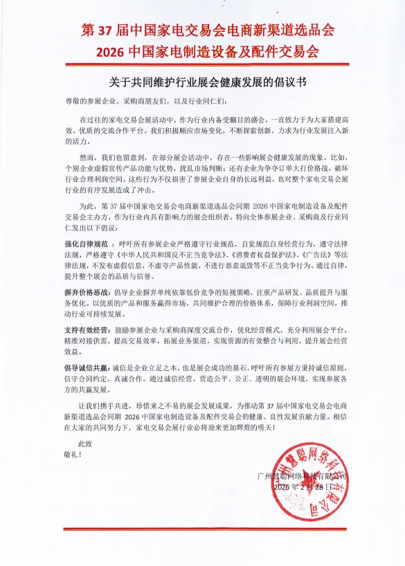 为守护家电交易会健康有序的发展生态,第37届中国家电交易会电商新渠道选品会、2026中国家电制造设备及配件交易会主办方正式发布《关于共同维护行业展会健康发展的倡议书》,向全体参展企业、采购商及行业同仁发出自律经营、诚信共赢的号召。