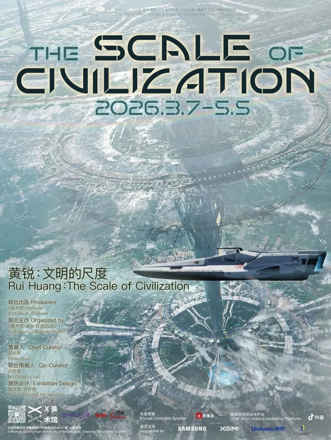 2026年3月7日至5月5日,X美术馆联合Stellaxis与首创·郎园Station于美术馆一层展厅欣然呈现中国新锐数字艺术家黄锐(Rui Huang)的全新个展“文明的尺度”。本次展览精选艺术家于近期创作的近40件数字艺术作品,通过数字艺术的介入,在虚拟生成的数理秩序与人类个体的知觉经验之间,构建了一场关于广域文明演化的视觉实验。这种创作范式源于人类观测位点与数字建模系统的深层交织,通过媒介的互联叙事,将个体的思辨转化为具体的视觉图景。X美术馆持续研究、关注并拓展当代数字艺术实践,展览“文明的尺度”作为X美术馆旗下数字艺术项目X虚拟X Virtual的年度大展,以实体展览的形式聚焦并支持国内数字艺术家黄锐的实践与发展。