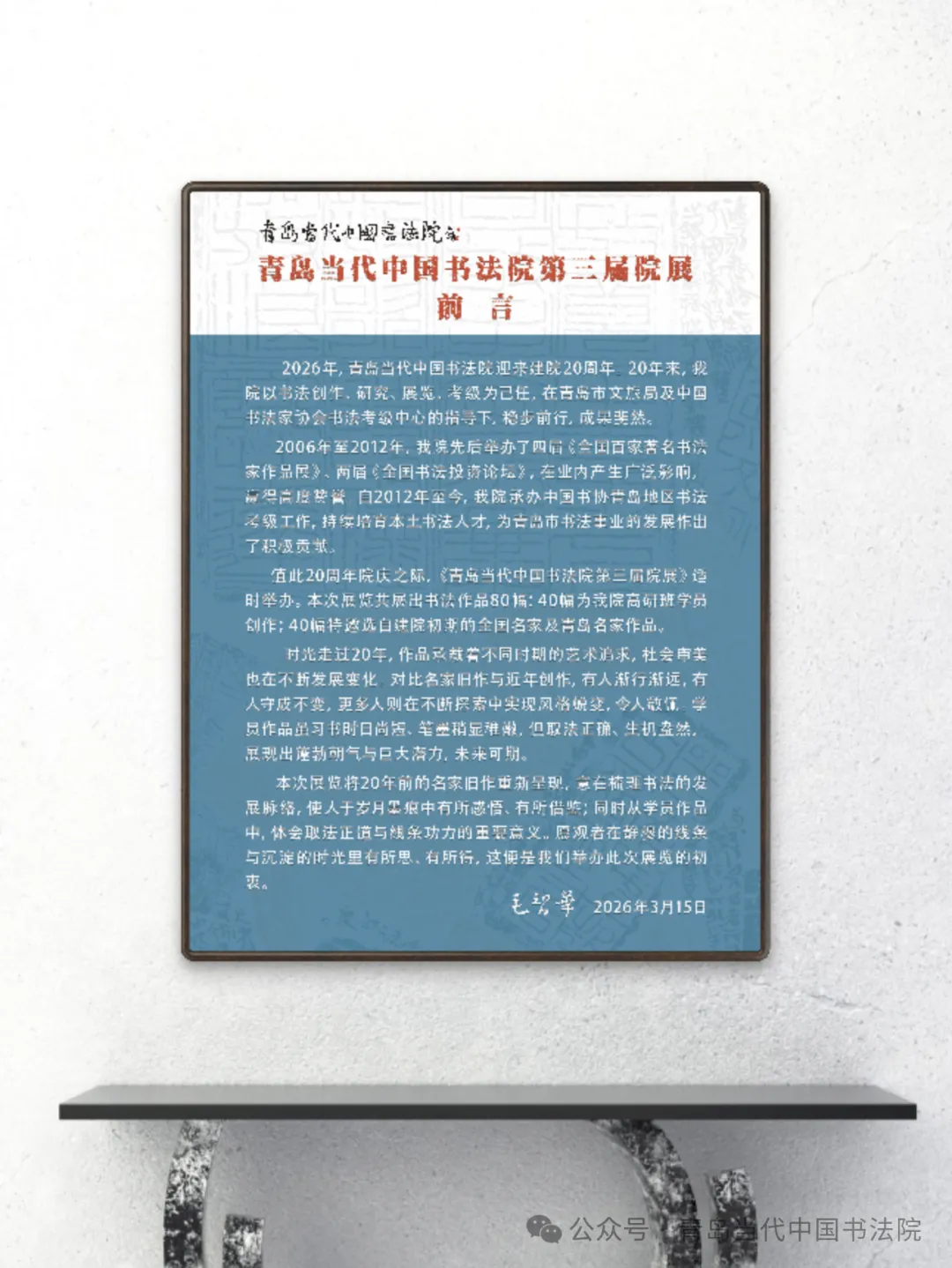 2026年,青岛当代中国书法院迎来建院20周年。20年来,我院以书法创作,研究,展览,考级为己任,在青岛市文旅局及中国书法家协会书法考级中心的指导下,稳步前行,成果斐然。