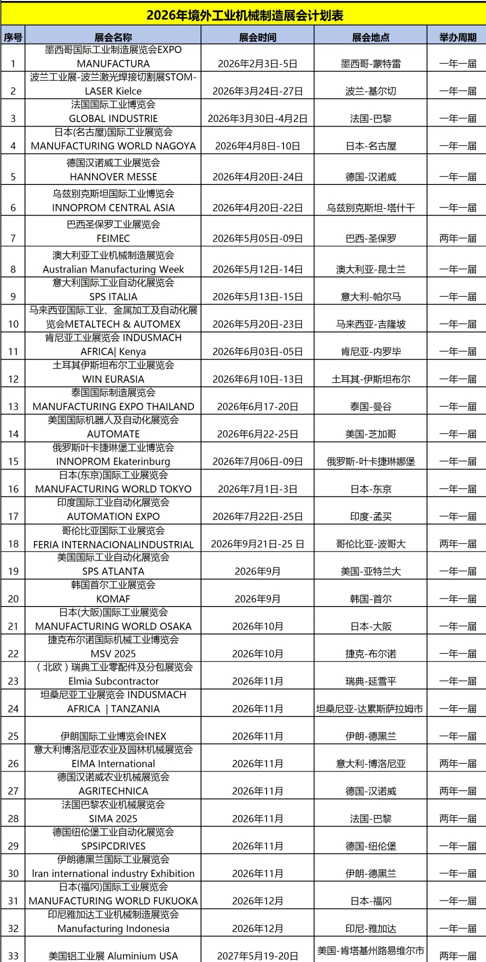 2026年全球工业机械制造展览会计划表