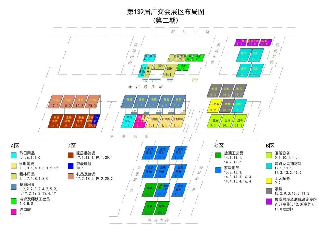 第一期 家用电器、电子消费品及信息产品、电子电气产品、照明产品、新能源、新材料及化工产品、五金、工具、加工机械设备、动力、电力设备、通用机械及机械基础件、工业自动化及智能制造、工程机械(室内/室外)、农业机械(室内/室外)、新能源汽车及智慧出行、摩托车、自行车、汽车配件、车辆 ![]() 建筑及装饰材料、卫浴设备、家具、餐厨用具、日用陶瓷、家居用品、钟表眼镜、礼品及赠品、节日用品、家居装饰品、工艺陶瓷、玻璃工艺品、园林用品、编织及藤铁工艺品、铁石装饰品及户外水疗设施 ![]() 第三期 玩具,孕婴童用品,童装,男女装,内衣,运动服及休闲服,裘革皮羽绒及制品,服装饰物及配件,纺织原料面料,鞋,箱包,家用纺织品,地毯及挂毯,办公文具,医药保健品及医疗器械,食品,体育及旅游休闲用品,个人护理用具,浴室用品,宠物用品,乡村振兴特色产品 ![]() |