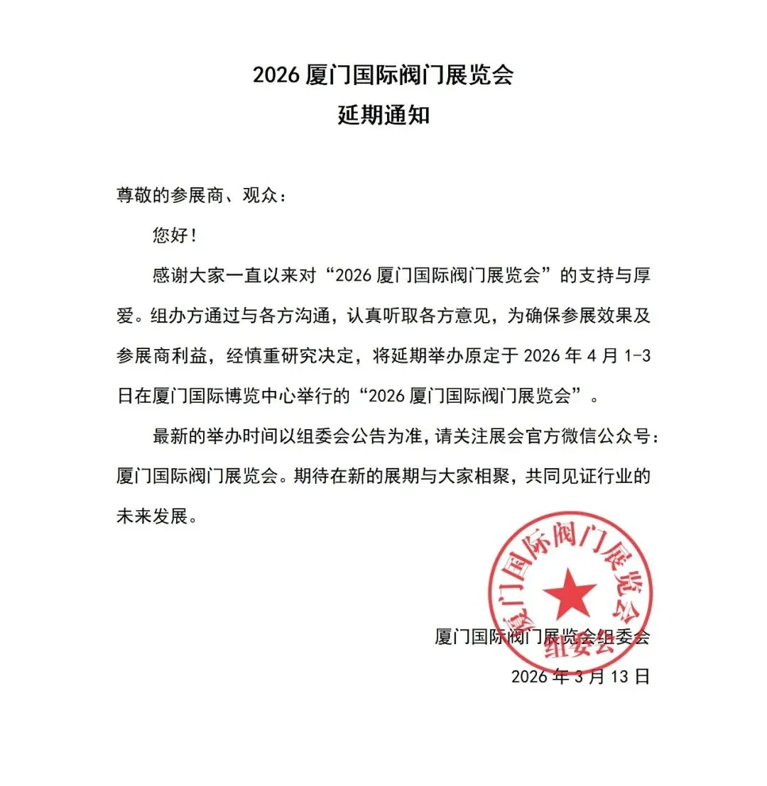 感谢大家一直以来对“2026厦门国际阀门展览会”的支持与厚爱。组办方通过与各方沟通,认真听取各方意见,为确保参展效果及参展商利益,经慎重研究决定,将延期举办原定于2026年4月1-3日在厦门国际博览中心举行的“2026厦门国际阀门展览会”。
