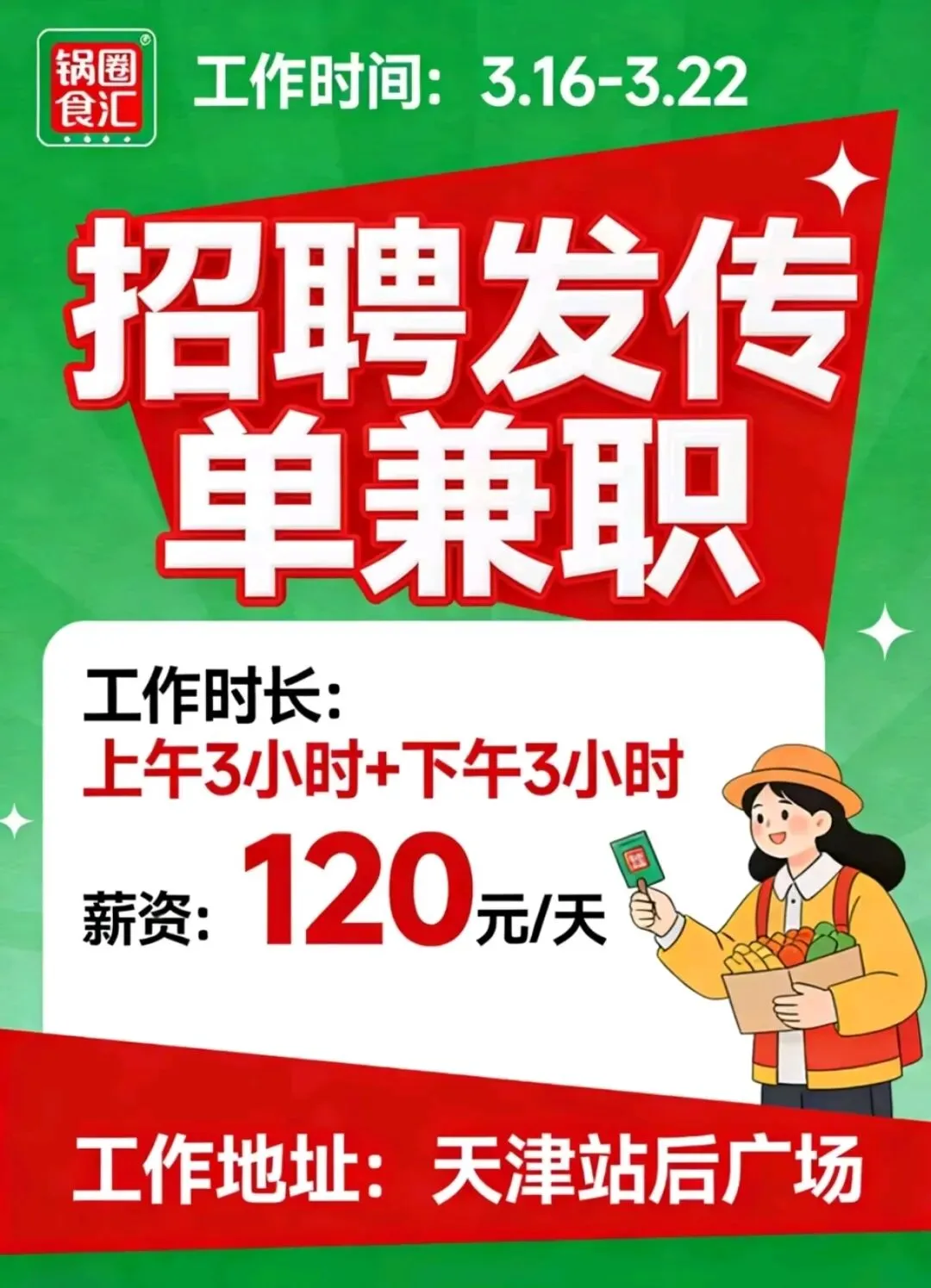 天津市河东区,天津站后广场锅圈食汇传单派发员,下周一到周四3人,周五到周日2人,每天工作时间6小时,120元每天,联系人欧阳毅18702220509