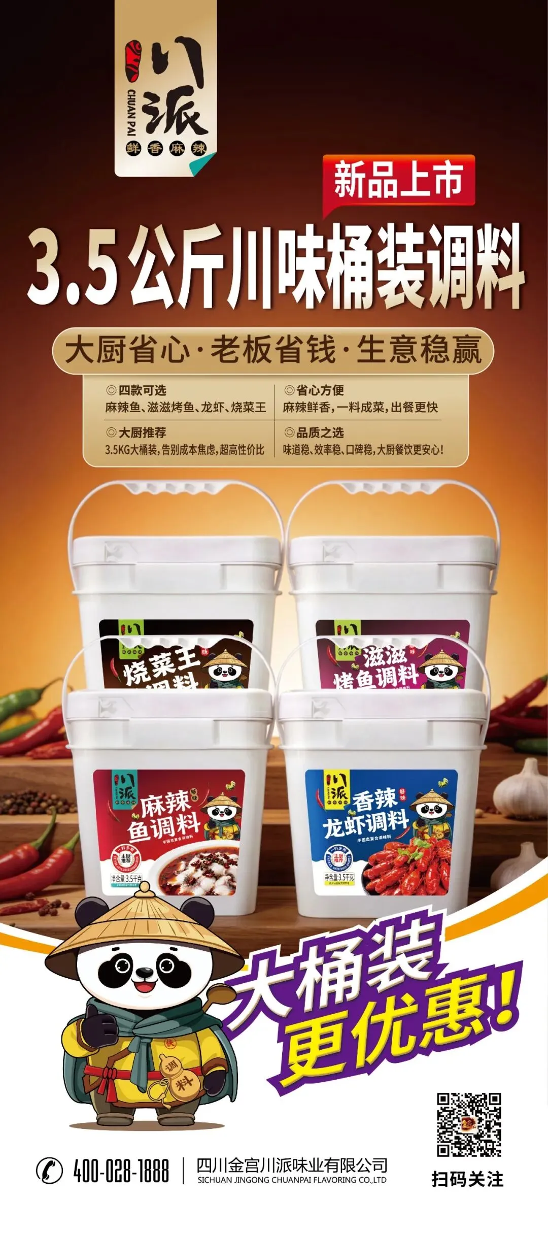 后厨降本神器:金宫震撼首发3.5KG商用大容量【川派香辣桶装系列】!包含川派麻辣鱼、滋滋烤鱼、香辣龙虾、烧菜王四款全能调料。该系列甄选郫县豆瓣与优质香辛料等配料,主打“一料成菜、规格大、出餐快、口味稳、省成本”。专为餐饮后厨量身定制,是老板们控成本、提效率的绝对利器!