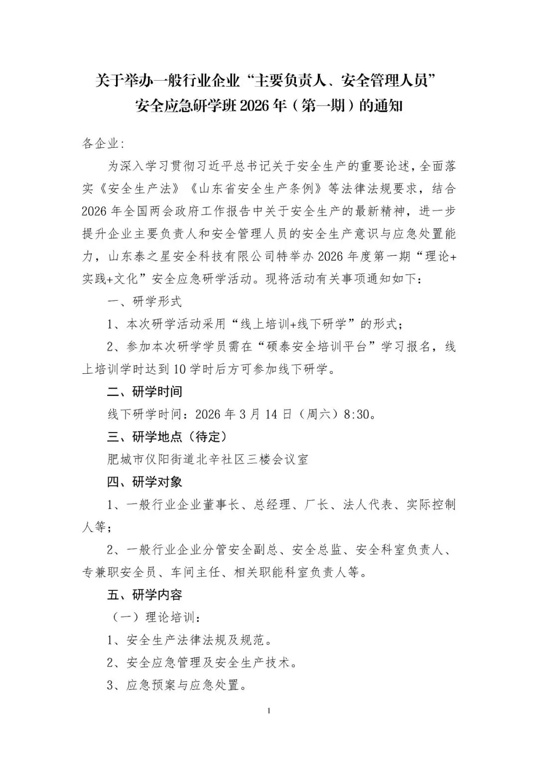 关于举办一般行业企业“主要负责人、安全管理人员”安全应急研学班2026年(第一期)的通知