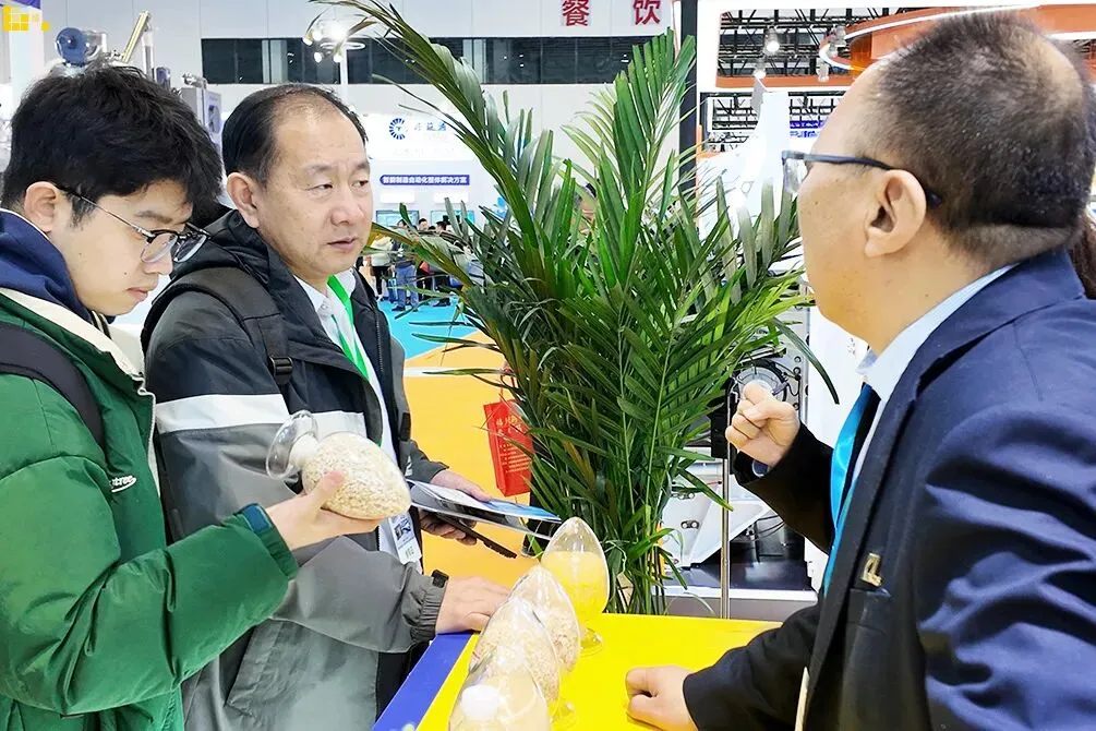 在苹乐展区,一组特殊的“展品”成为了全场焦点——金黄的玉米皮、高纯度的玉米蛋白粉、清澈透明的葡萄糖液。这些由玉米干法分离制糖技术产出的试验成品,以最直观的方式,向现场观众呈现了干法分离工艺的出色效果,赢得连连赞誉,咨询洽谈者络绎不绝。