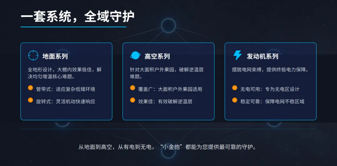 陕西长风防霜科技有限公司,专注于智能防霜设备的研发与制造,致力于为全球农业提供最可靠的霜冻解决方案。我们的核心品牌“小金炮”,已成为行业内的知名品牌,产品远销国内外。
