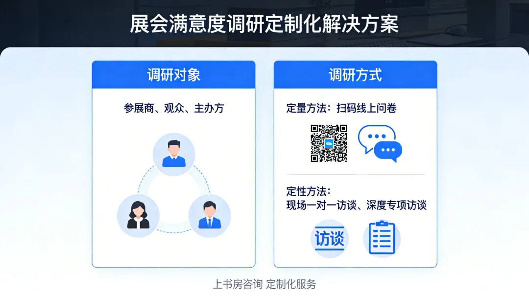 上书房咨询针对展会满意度调研的核心需求,打造了定制化的调研解决方案,调研对象全面覆盖参展商、观众、主办方三大核心群体,调研方式融合扫码线上问卷、现场一对一访谈、深度专项访谈等定量与定性方法,根据展会规模与需求精准设定样本目标,确保调研数据的代表性、真实性与有效性。