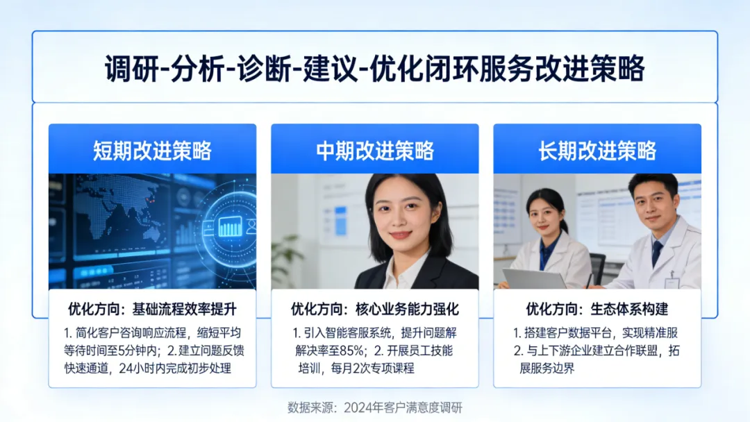 不仅能输出每季度《季度汇总分析报告》、年底《全年满意度白皮书 / 总报告》等专业报告,还能提供原始数据文件,并通过问题诊断矩阵、趋势对比等方式,精准定位展会服务的优势区、改进区与机会区,同时结合调研结果提出分短期、中期、长期的可落地改进策略,明确优化方向与执行要点,实现 “调研 - 分析 - 诊断 - 建议 - 优化” 的闭环服务,让调研数据真正成为展会服务升级、运营优化的决策依据。