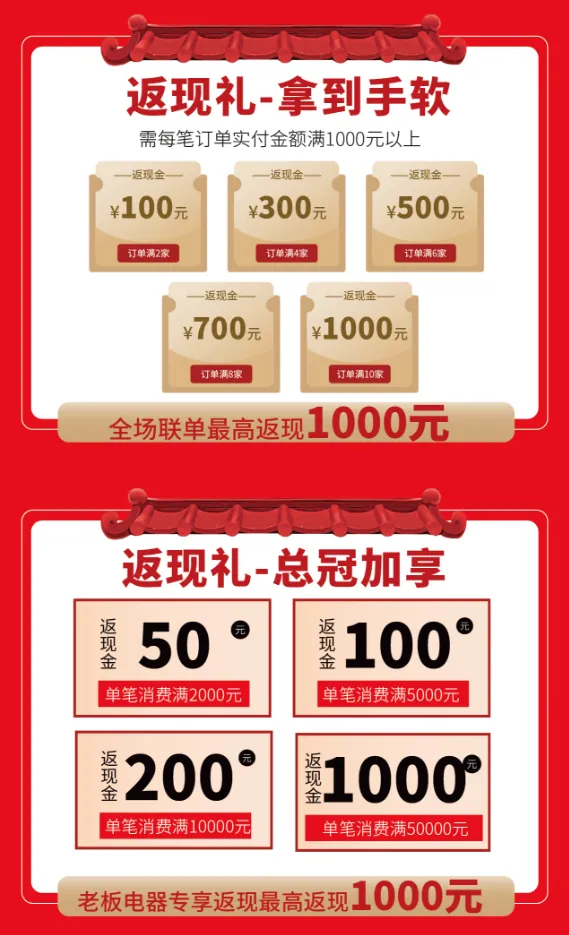 订单满2家且每笔订单实付金额满1000元即可返现,最高返现1000元。