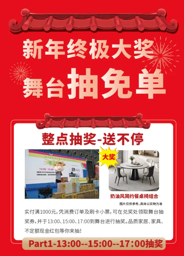 单笔订单实付满1000元,可凭抽奖券于13:00、15:00、17:00到舞台进行抽奖。品质家居、品牌家具、不定额现金红包等你来拿!